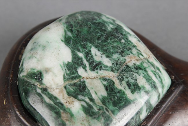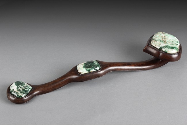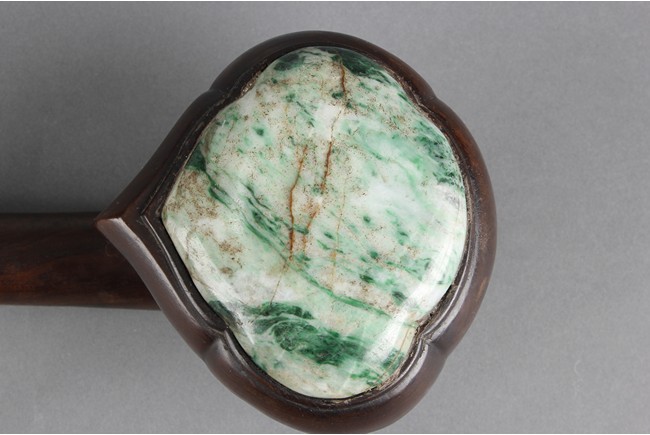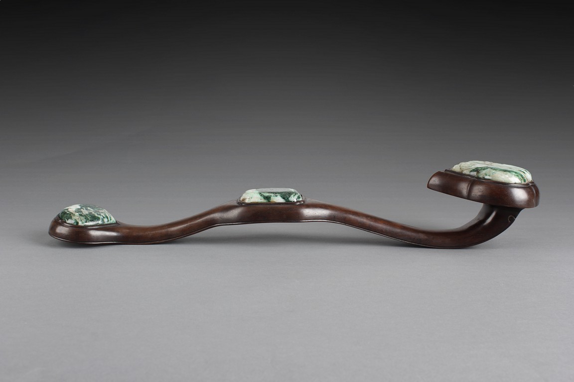 The ruyi is decorated with three jade pieces, the top and handle part of the jade inlaid are in the ruyi form, middle jade of rectangular form, all embedded on a smooth and natural toned Zitan wood handle.