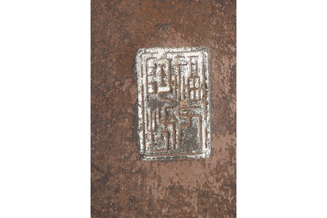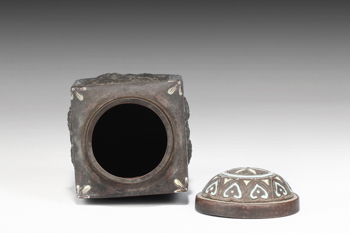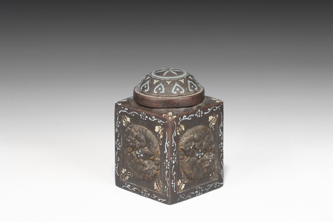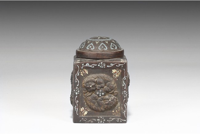 The teapot carved with two buddhist lions on four sides in relief, the cover with painted leave motif, the bottom with four character mark.