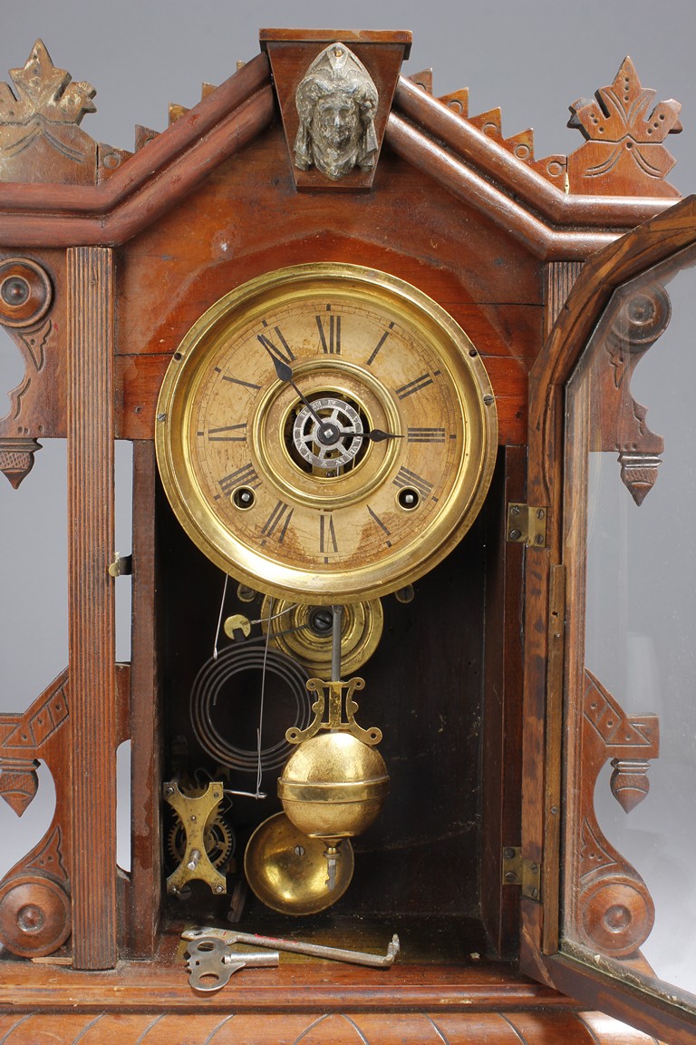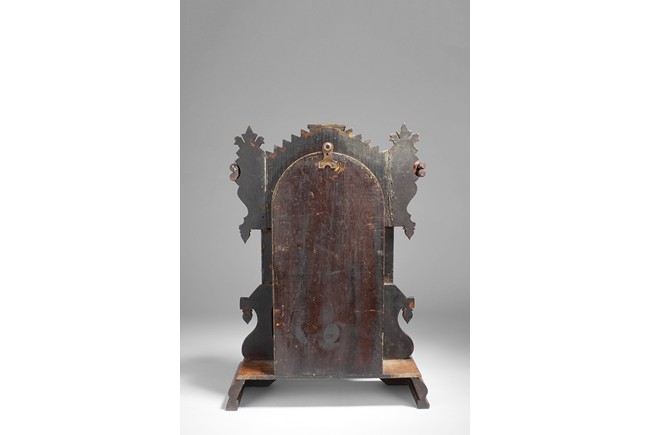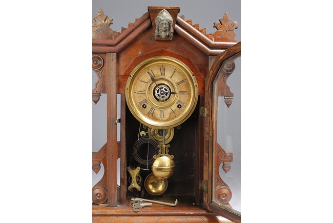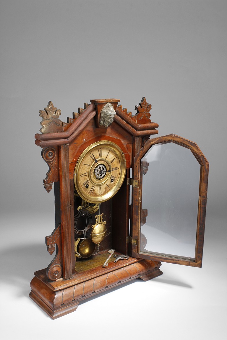 The table clock in the shape of a house, with clock face at top center, with pendulum below within a glass housing.