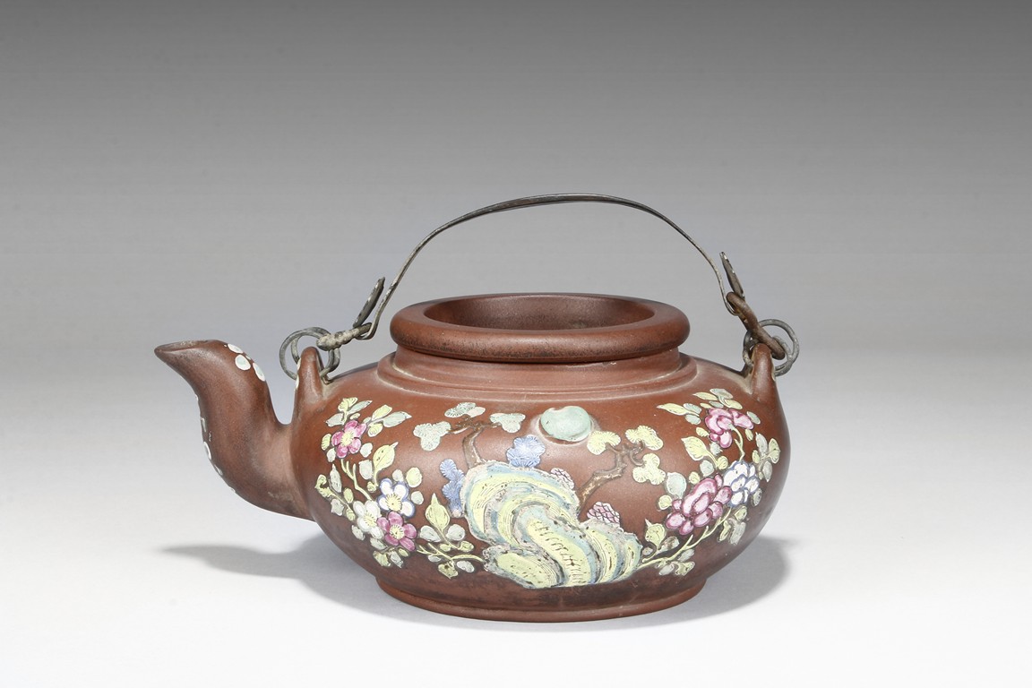 "Of compressed globular form, the teapot's exterior decorated with colorful plum trees, flowers, and viewing rocks, the arched double metal handle extends over the top of teapot, the thick spout raises upwards, the lid has a bowl-like caved-in design without finials, bottom bears four character mark, two character ""Yu Feng"" mark within gourd on the lid. The brand ""Yu Feng"" was created by father and son, Wu Tongjun and Wu Qinan. It was as famous as the teapot brand ""Fu Kang Ji"", established by famous pottery maker Xu Hantang's grandfather Xu Jinseng and father Xu Zuchun. This particular style was very popular among the civilians. Republic period."