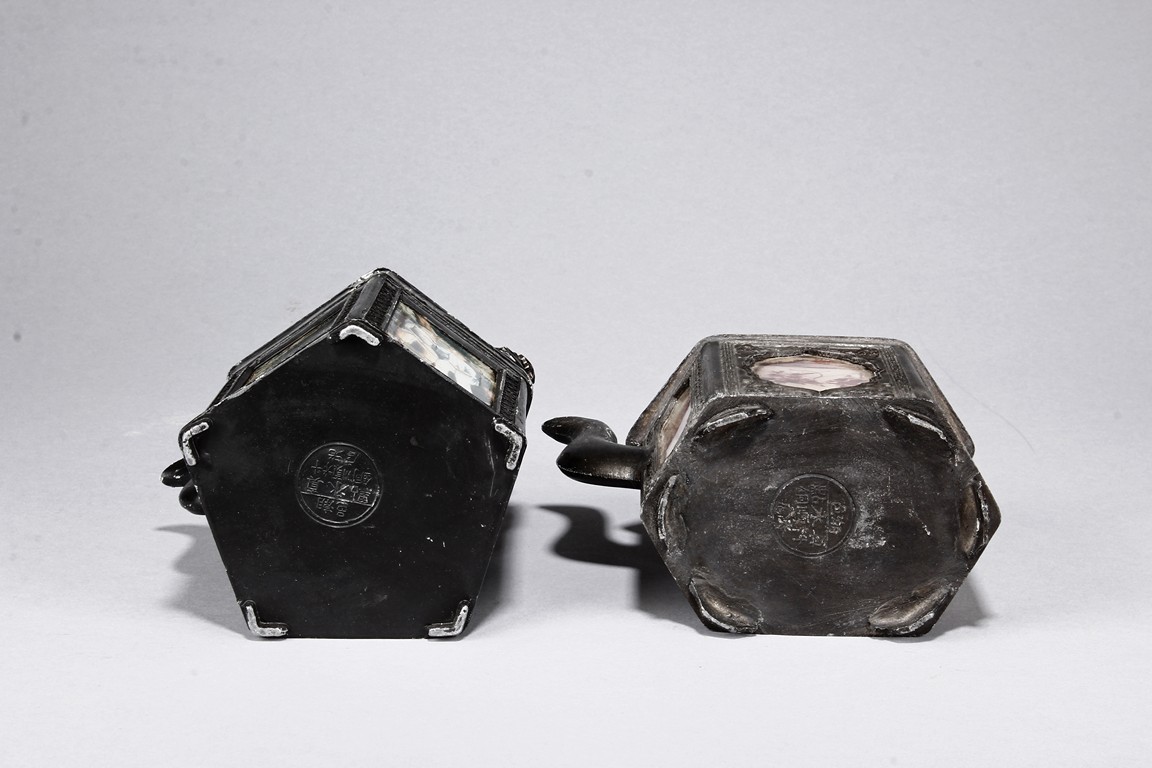 A PAIR OF TWO OCTAGONAL TIN TEAPOTS WITH MARK    民國 錫提樑壺兩把