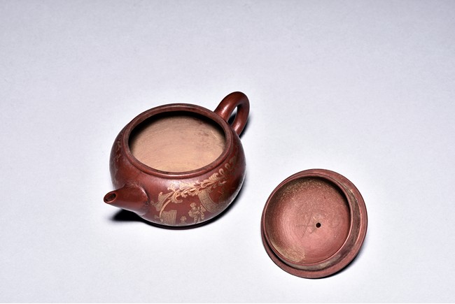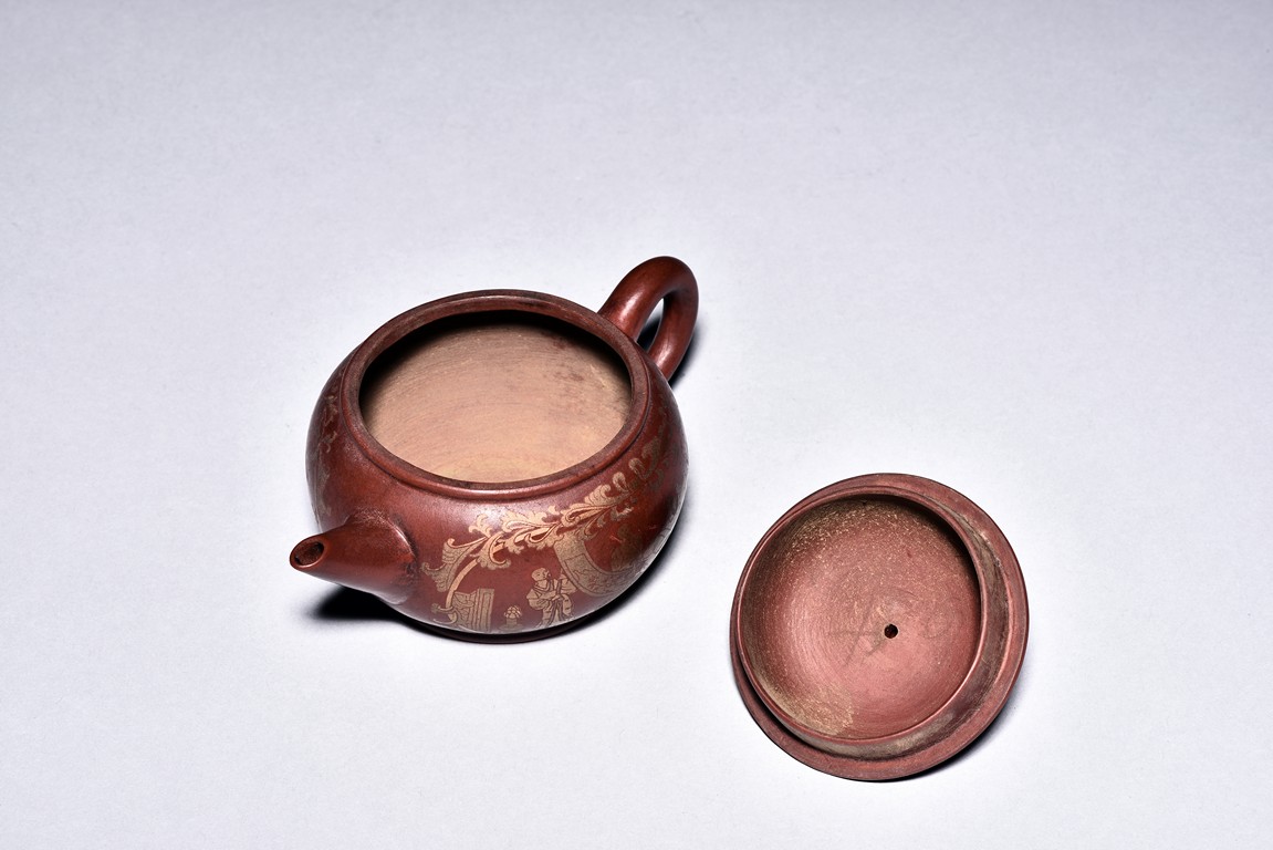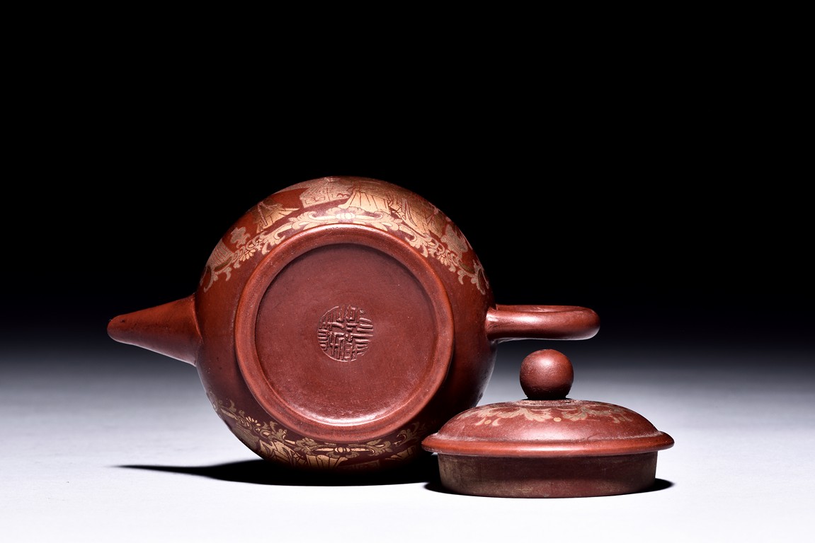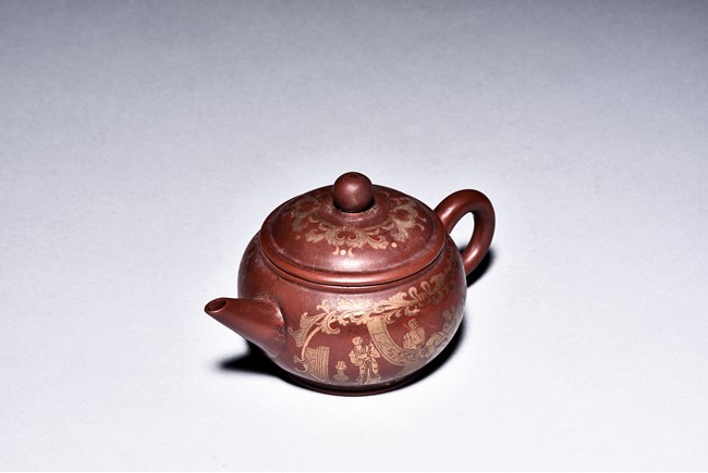 A YIXING GILT-PAINTED TEAPOT 描金人物紫砂壺