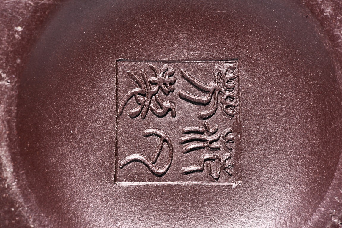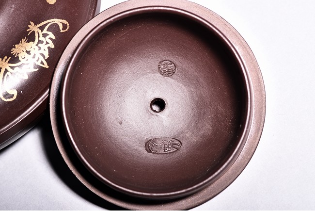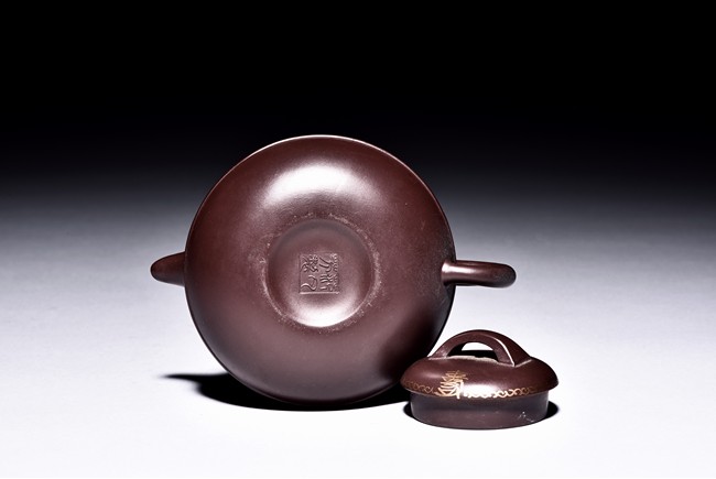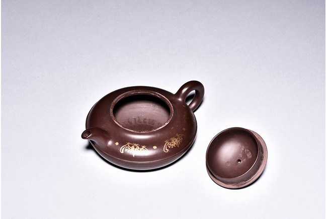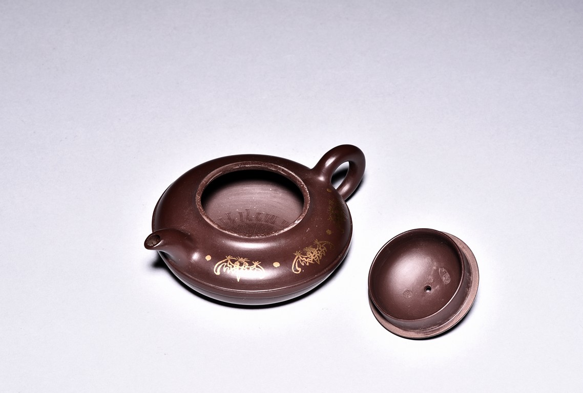 A YIXING COMPRESSED GILT-PAINTED TEAPOT 描金紅泥紫砂扁壺