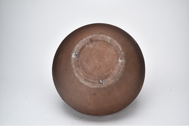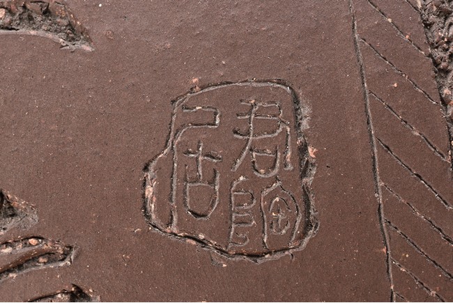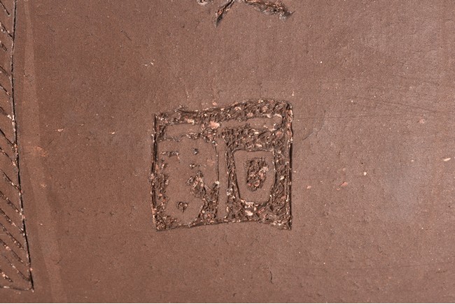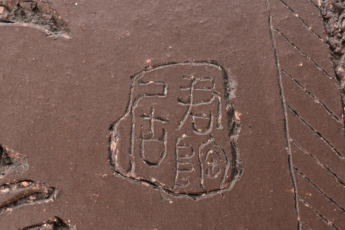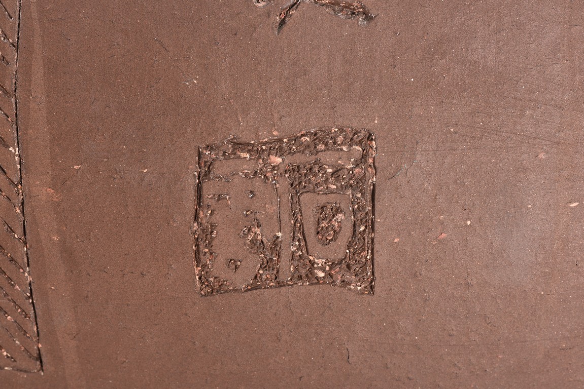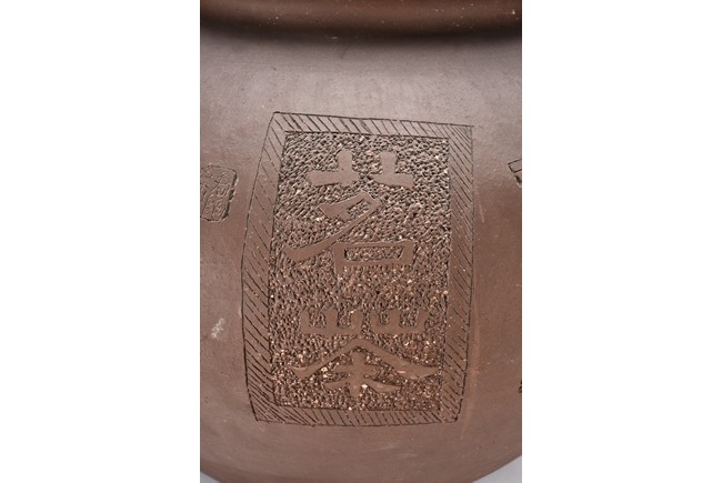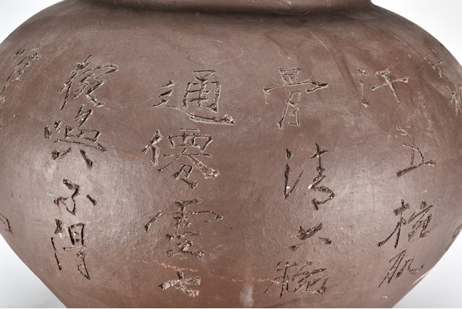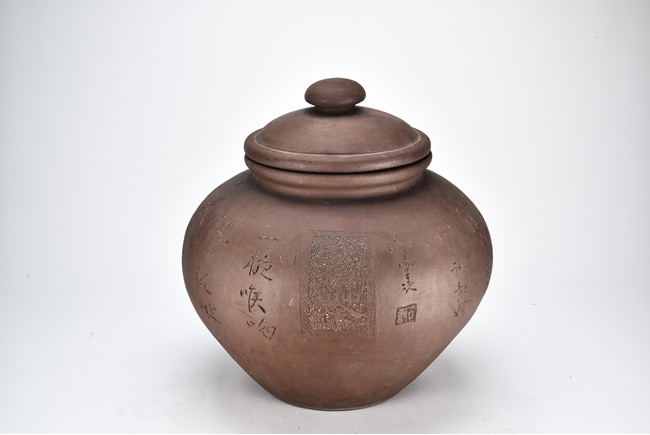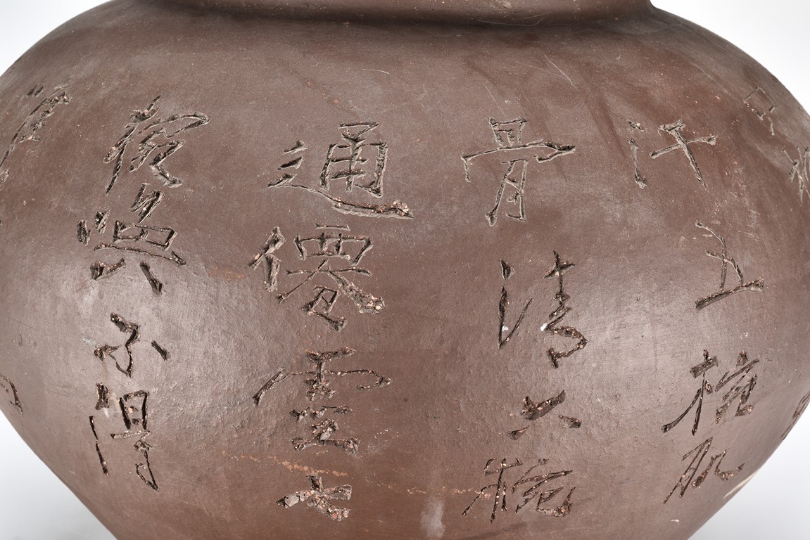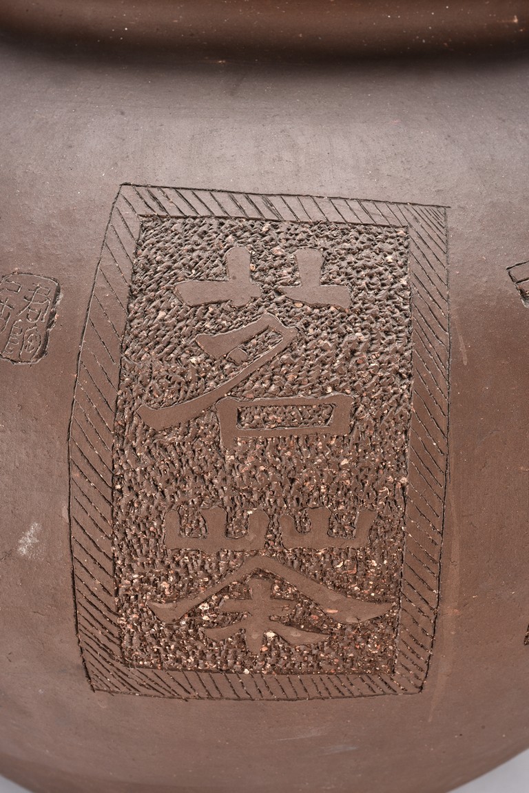 Of compressed ovoid form, the jar is incised with poetic inscription on the body with two seals of the artist, with a domed cover surmounted with finial. 19th Century.