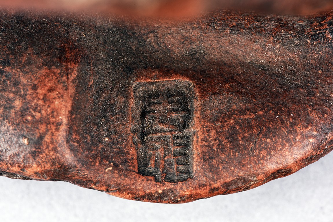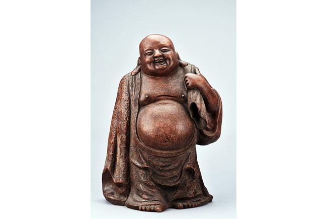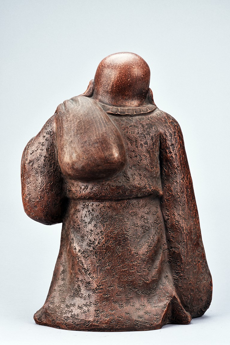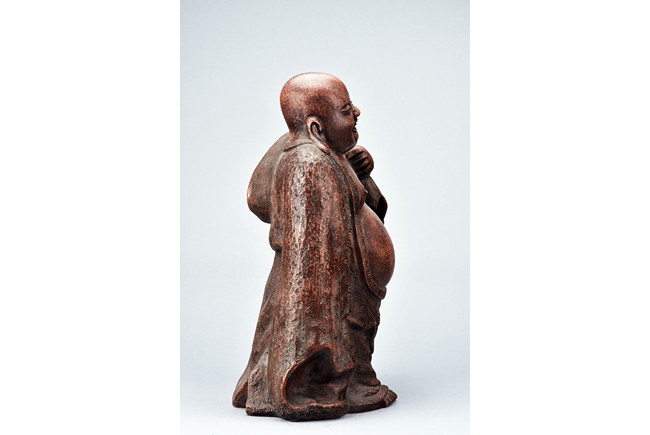 The figure is shown standing wearing long and voluminous robe, revealing chest and large belly, the hem incised with key-fret pattern, left hand holding a bag over shoulder, the face with laughing expression, flanked by long earlobes, Qing Dynasty period.
