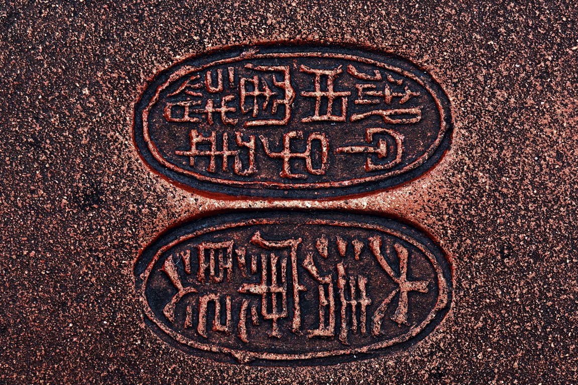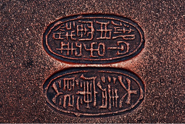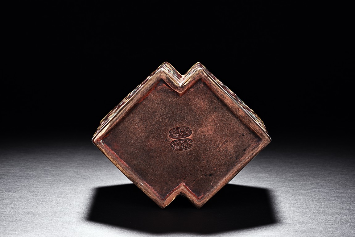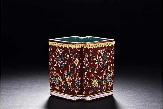 The brushpot is modelled in the form of two fused rectangular brushpot, the interior with turquoise green ground, the exterior decorated with flowers on red ground. The bottom bears two marks. Qing Dynasty period.