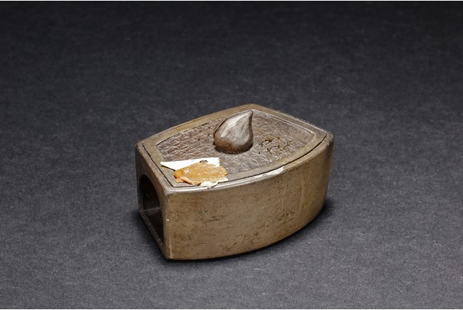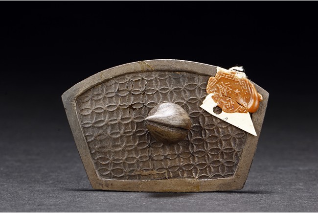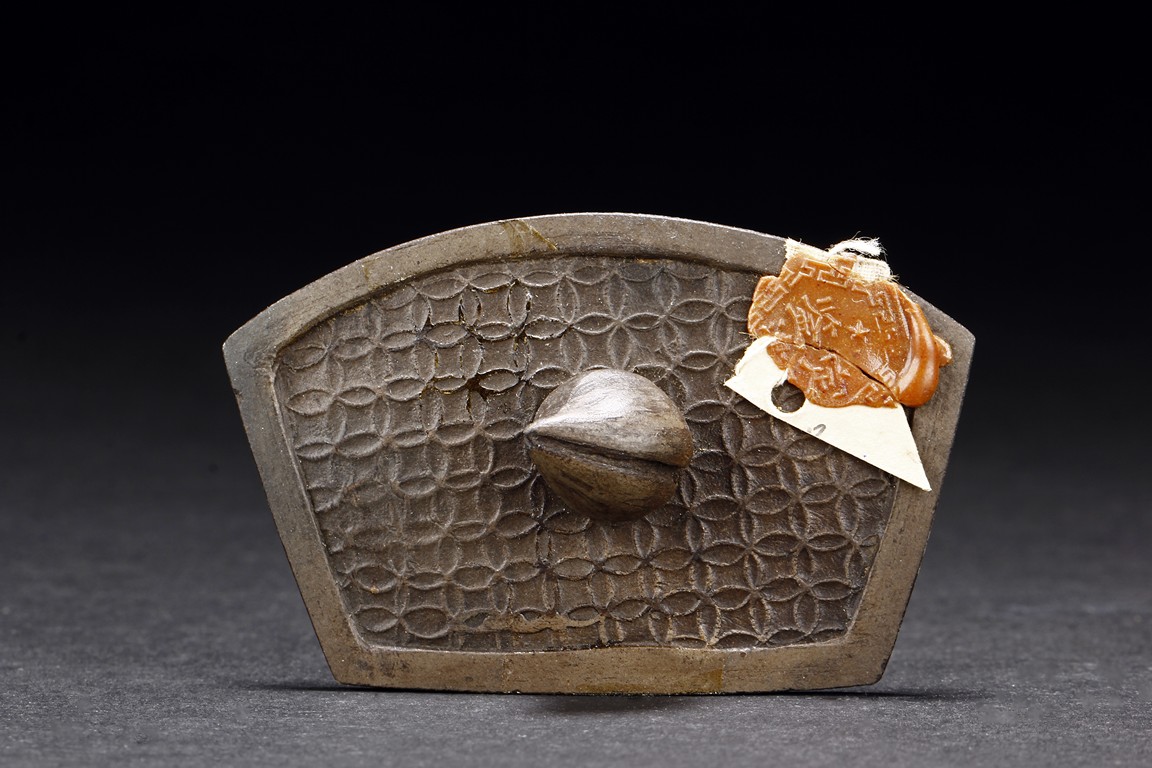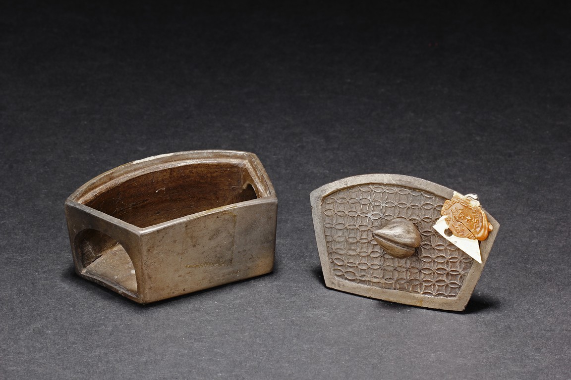 Of fan shape, this Yixing Zisha box has a cover topped with peach shaped knob on a network of coin patterns. The bottom bears three Chinese characters mark.
