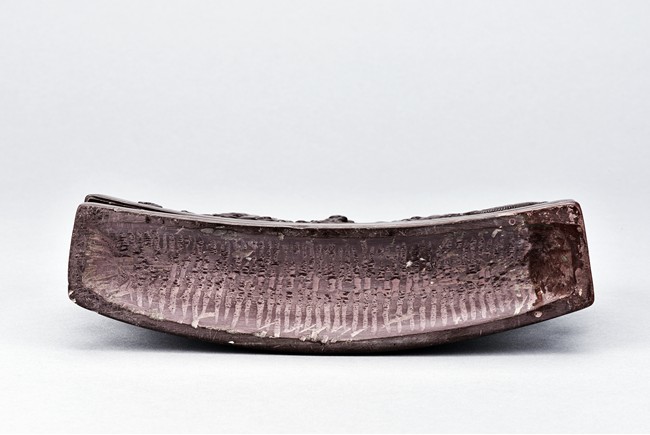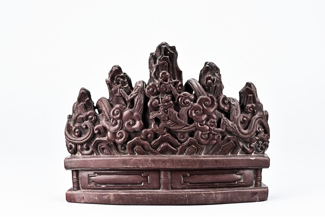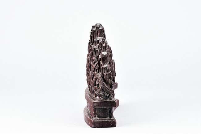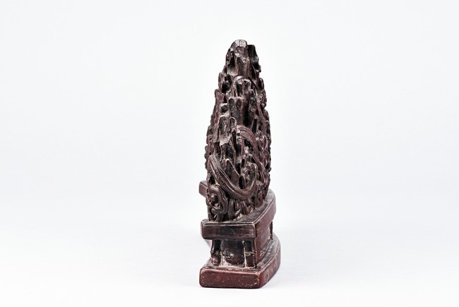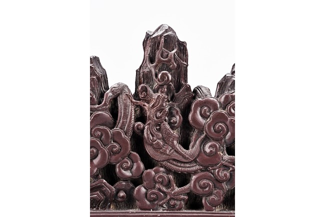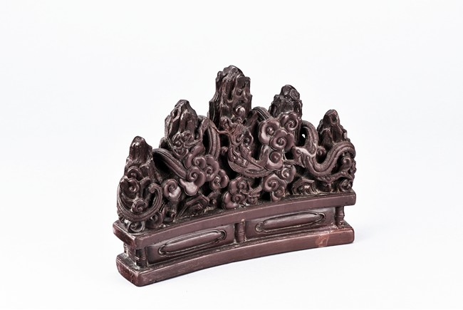 The brushrest is modelled in the shape of five peak mountain, with two dragons in pursuit of a flaming pearl to the front and reverse twisting around the peaks amid auspicious clouds.