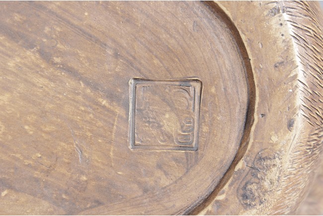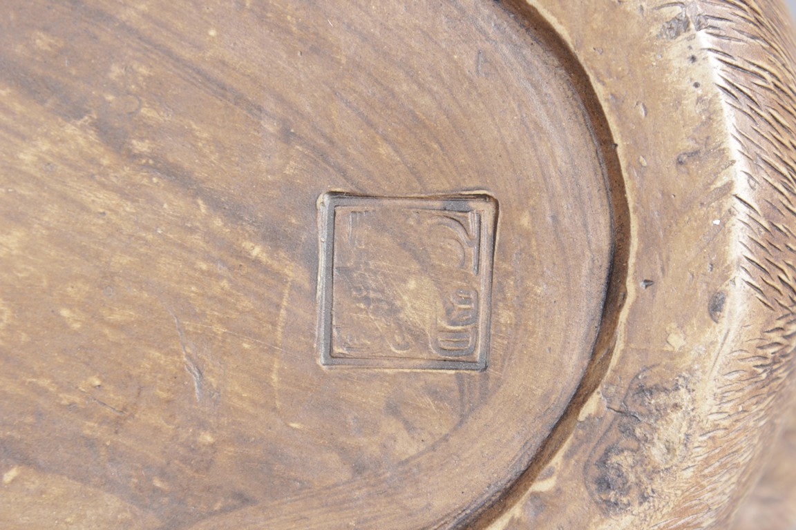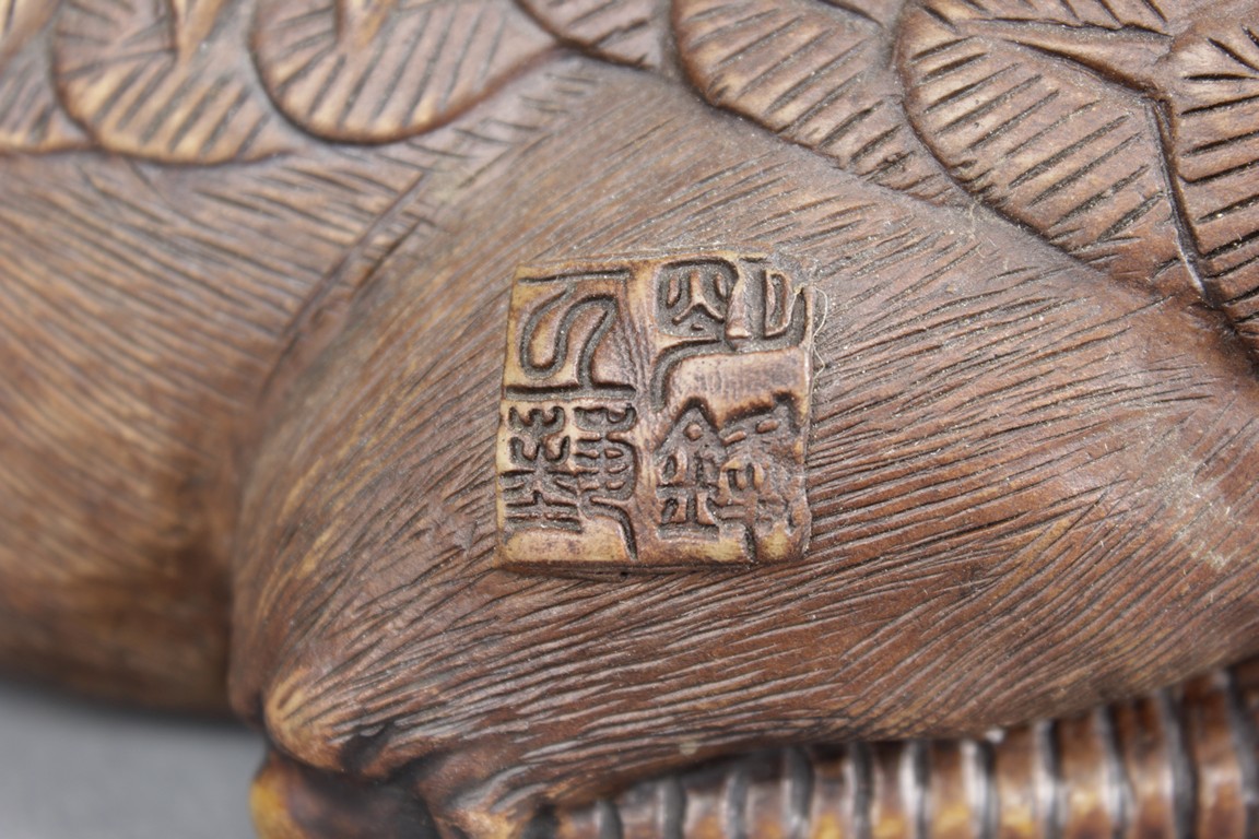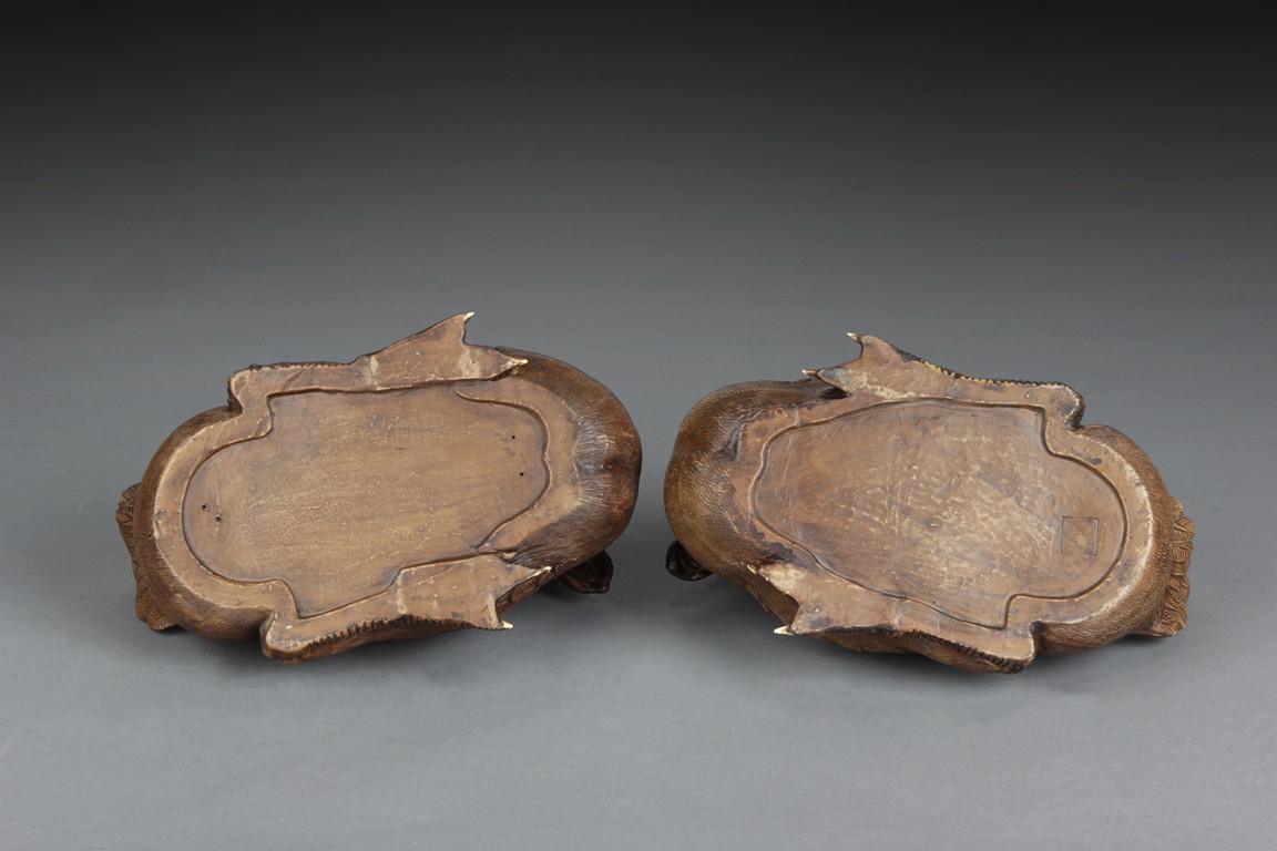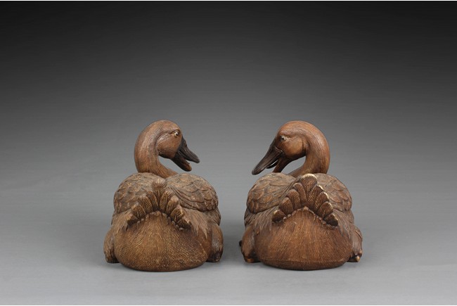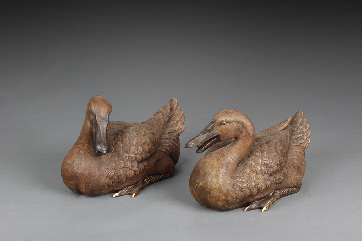 Intricately carved and detailed, the ducks were in seated position, feet and body resting directly on the ground, wings collapsed, tails up, and beaks slightly open, four characters mark on the side of one duck.