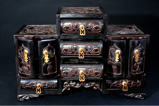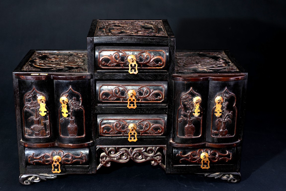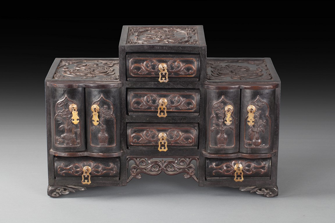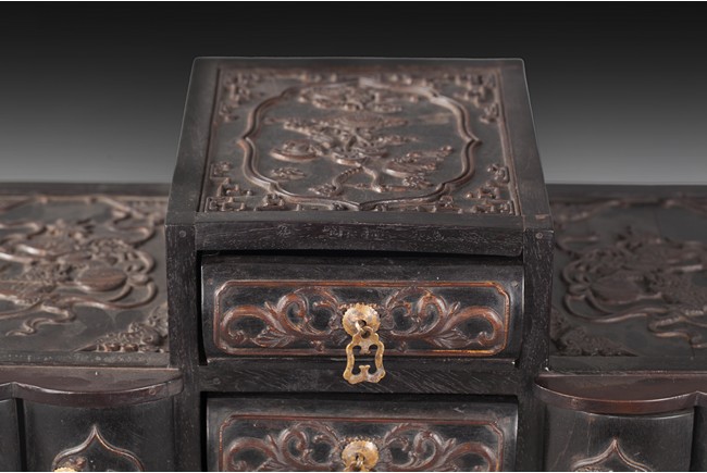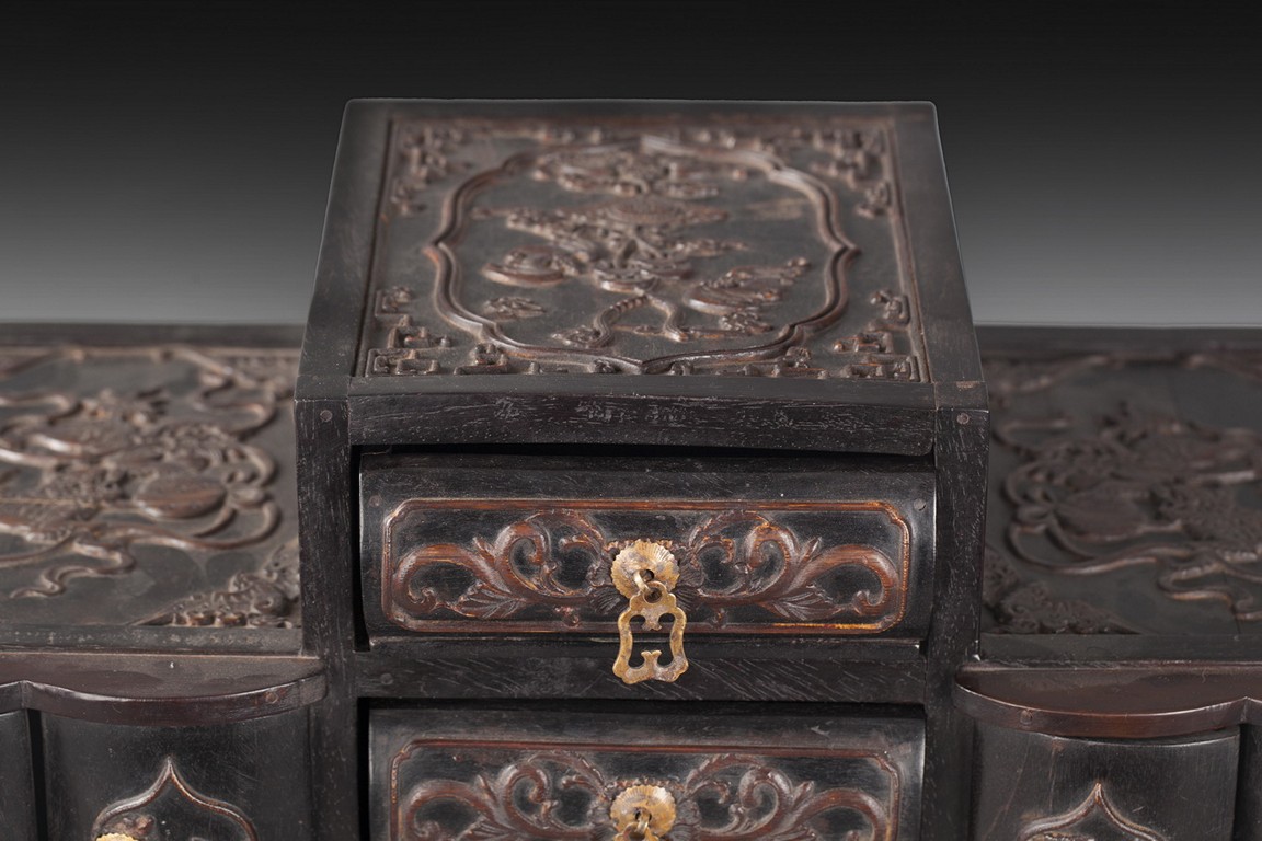 The box was intricately carved from Zitan wood, with five drawers and two storage spaces. Each surface is intricately carved with different patterns, such as vine, flowers, bats, coins, mythical beasts, and others. All drawers and doors have bronze hanging handle. Qing Dynasty period.