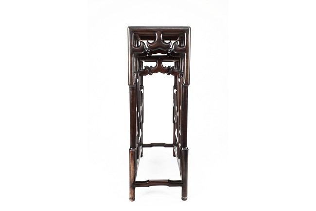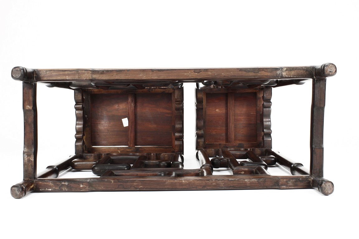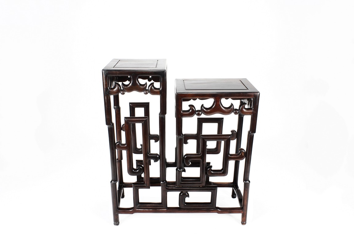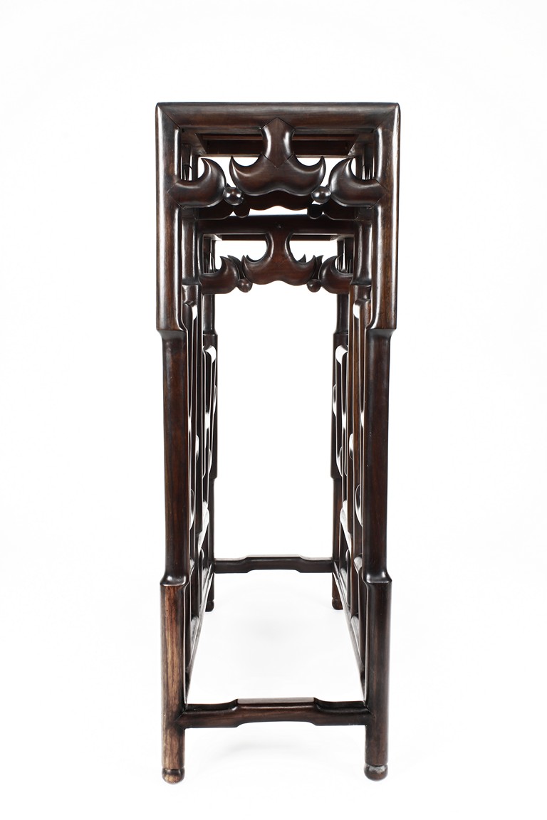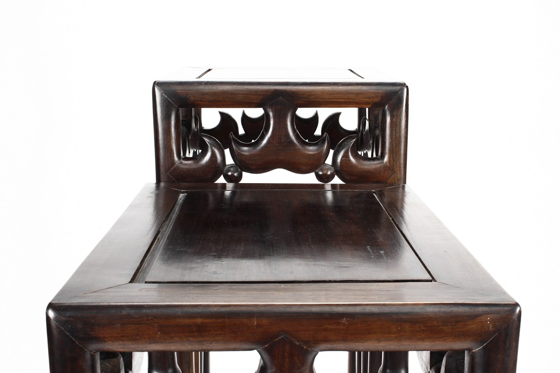 The sidetable made from hongmu wood, consists of two uneven table tops, connected from the bottom with stylized stretchers, hipped legs with stepped openwork squared-scroll brackets, stands on bead-form feet.Qing dynasty period.