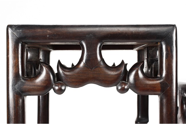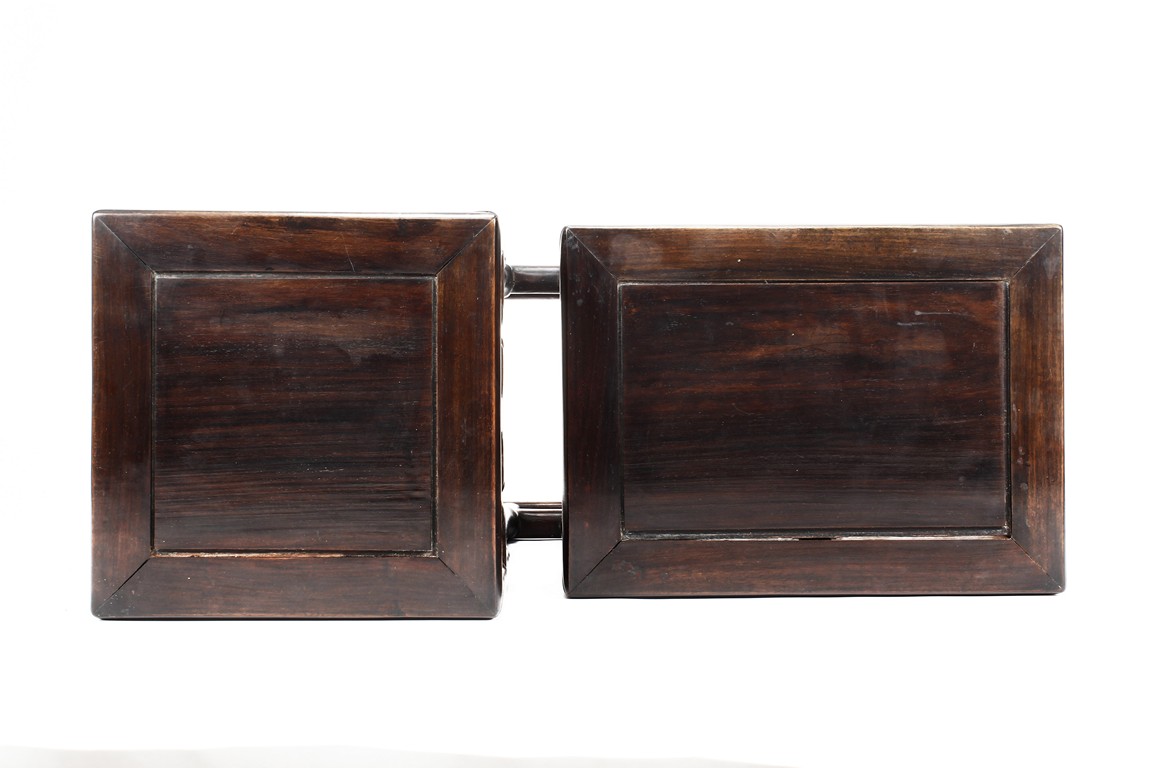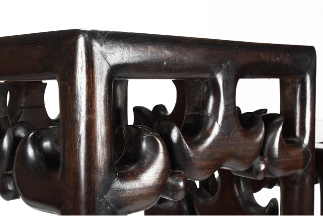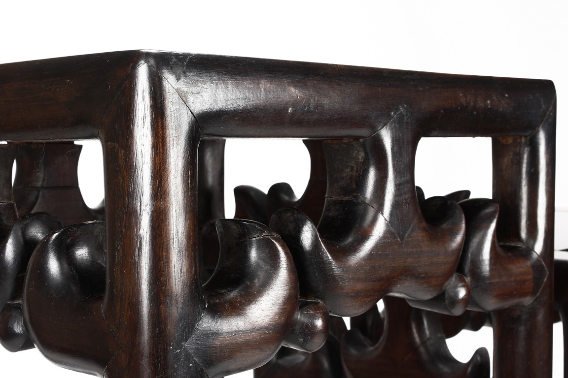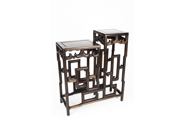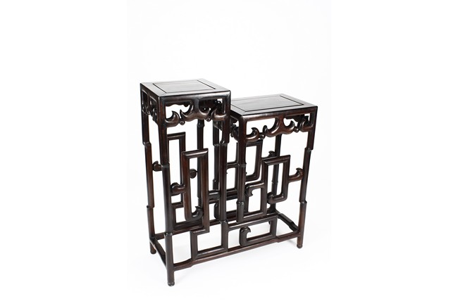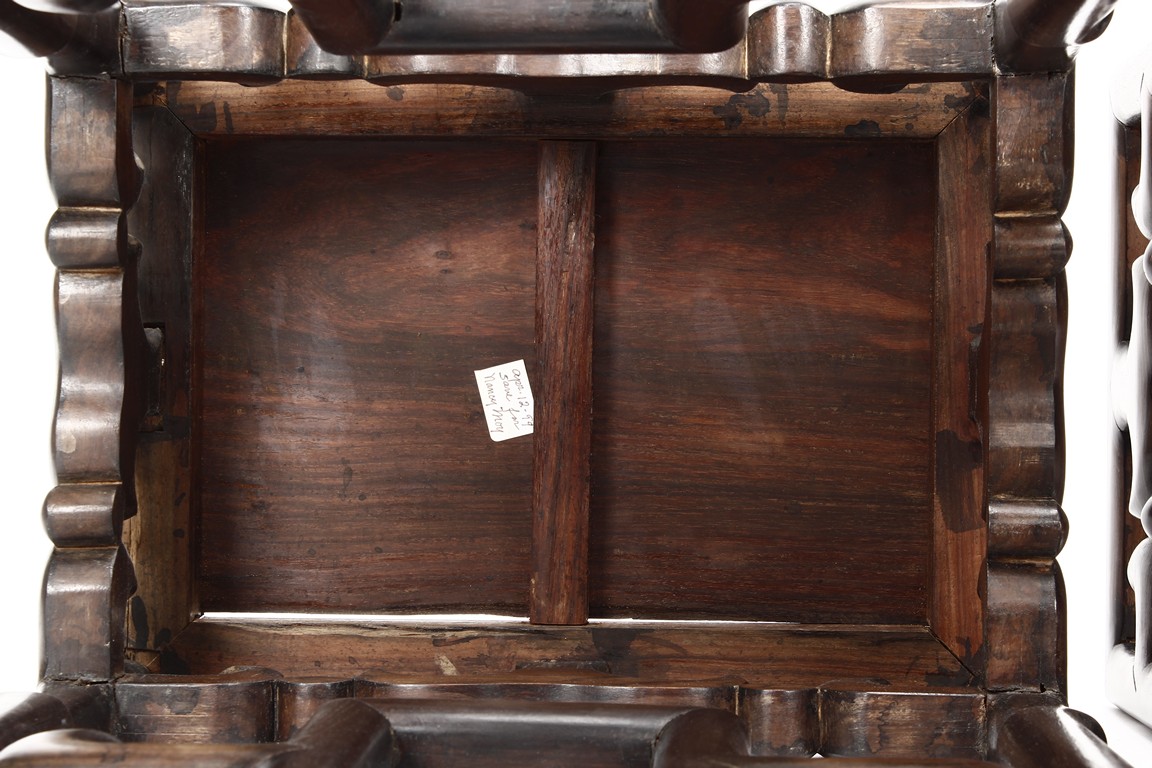 The sidetable made from hongmu wood, consists of two uneven table tops, connected from the bottom with stylized stretchers, hipped legs with stepped openwork squared-scroll brackets, stands on bead-form feet.Qing dynasty period.