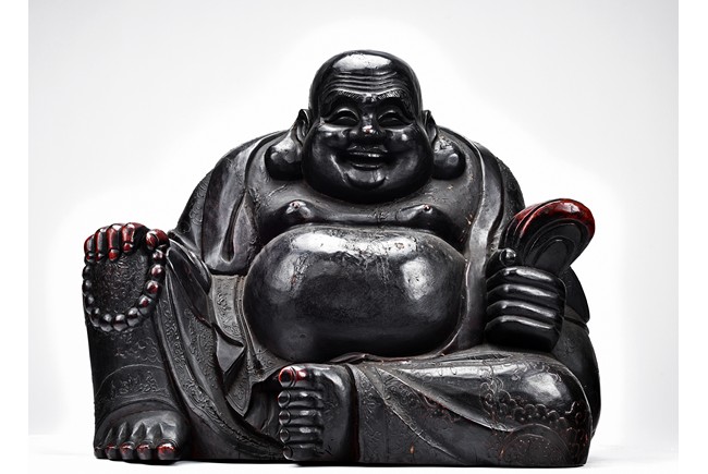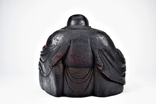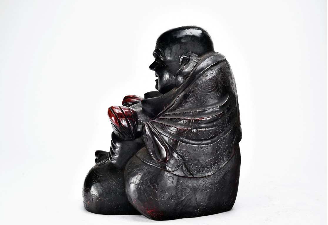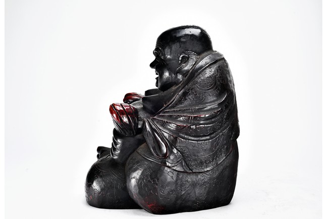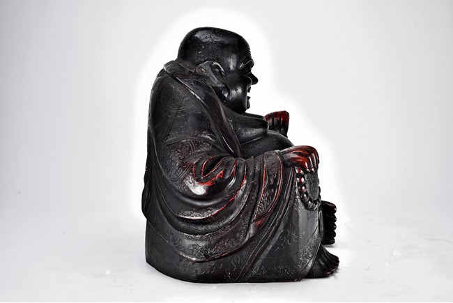 Carved with one leg raised and another resting at ease, the bodhisattva holding prayer beads in right hand and left hand holding cloth soak, the face with laughing expression. Republic period.