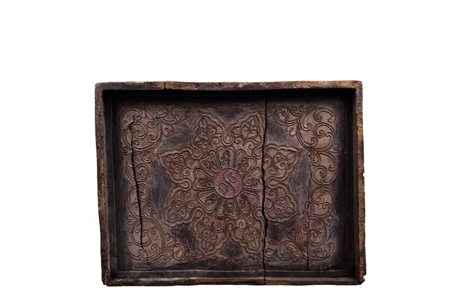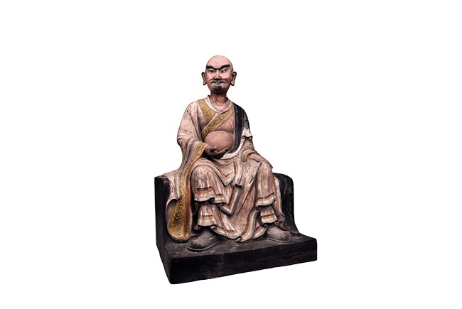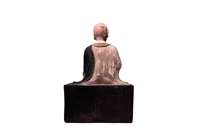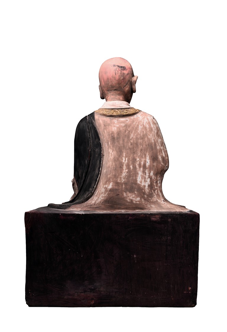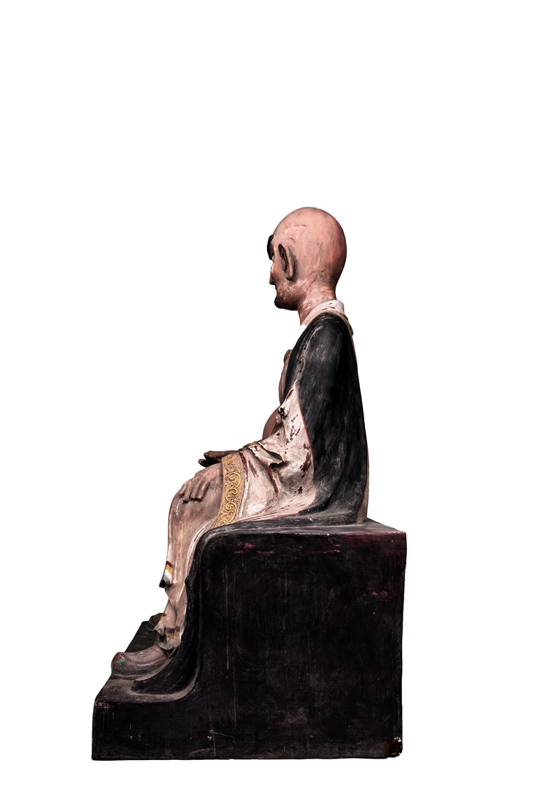 Carved seating on a plinth, the left hand resting on lap, right hand as if holding a bowl, wearing long and voluminous robe, the hems with yellow pigments and carved with floral scrolls, the face with stern expression. Republic period.