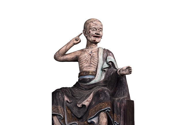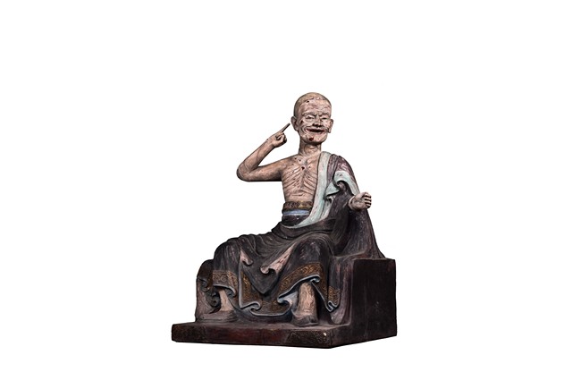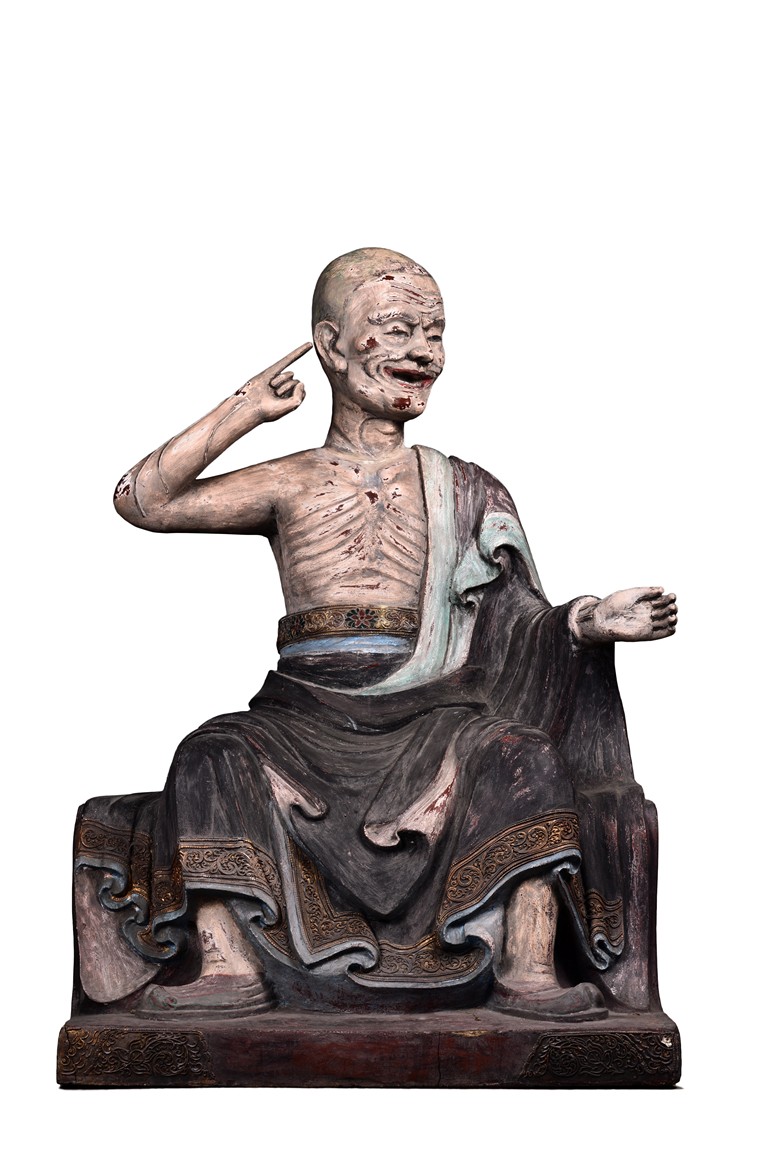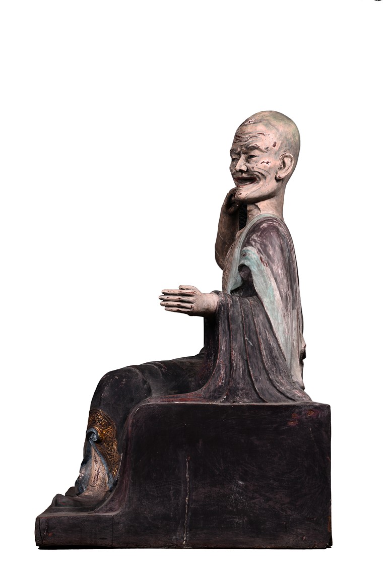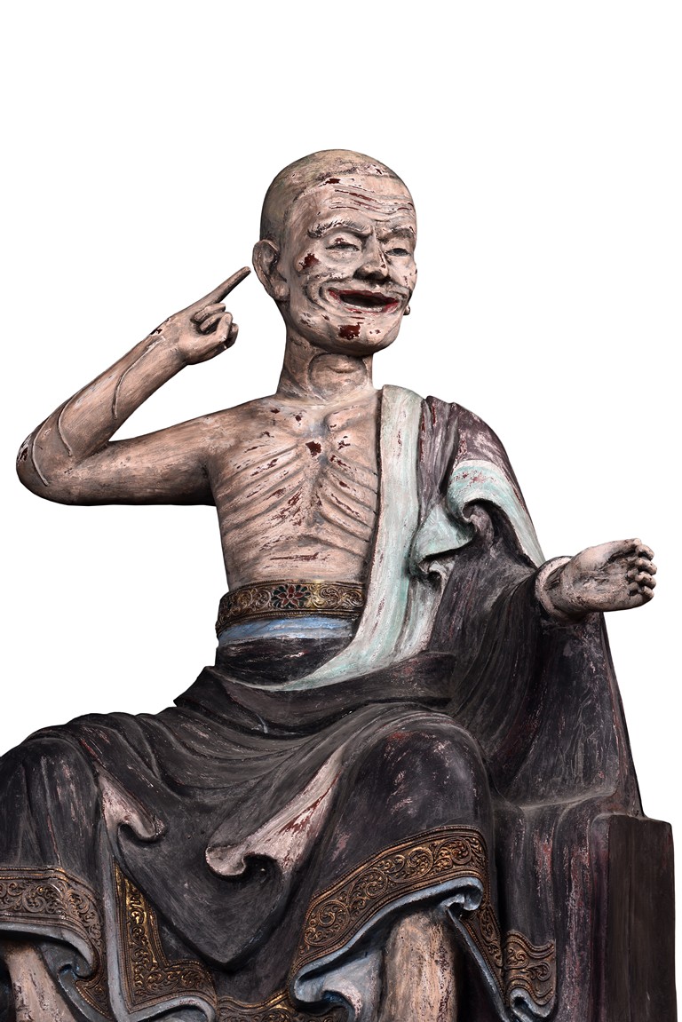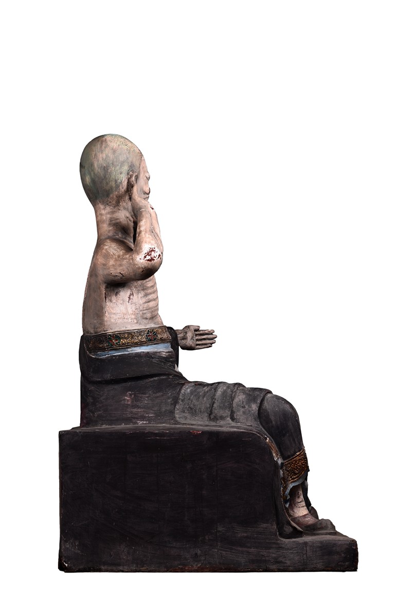 Carved seating on a plinth, right hand raised with little finger pointing to right ear, wearing black painted robe, with bare right shoulder and chest revealing skeletal rib cage, the hems decorated in gilt with scroll pattern, the face with smiling expression. Republic period.