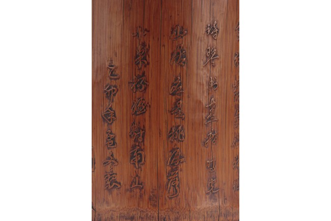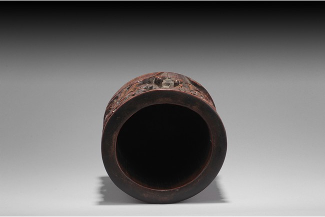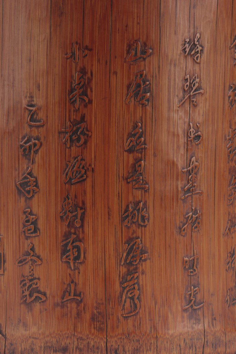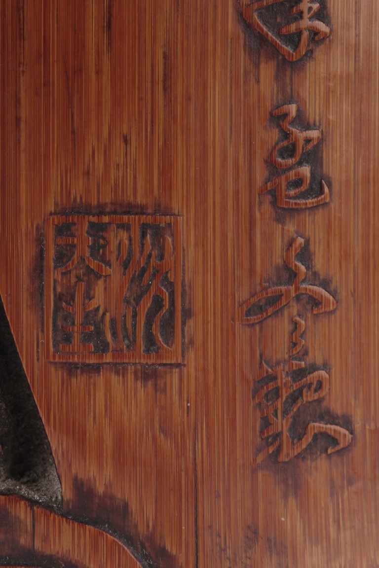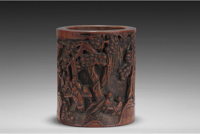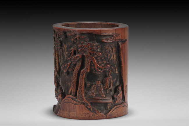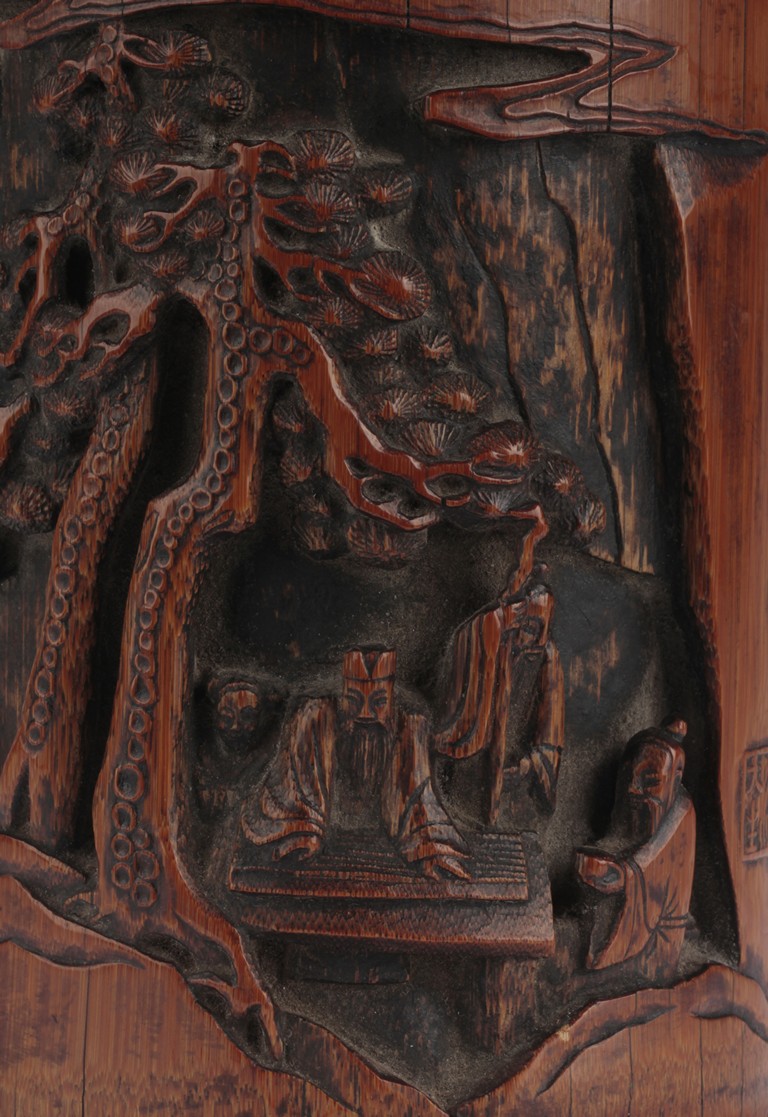 Of cylindrical form, the brush pot low relief carved with elders and kids enjoying different activities within a mountain and forest setting, the back carved with Chinese poem, complete with artist signature and mark. Republic period.