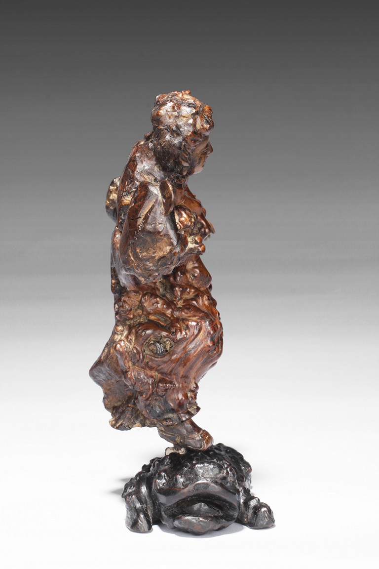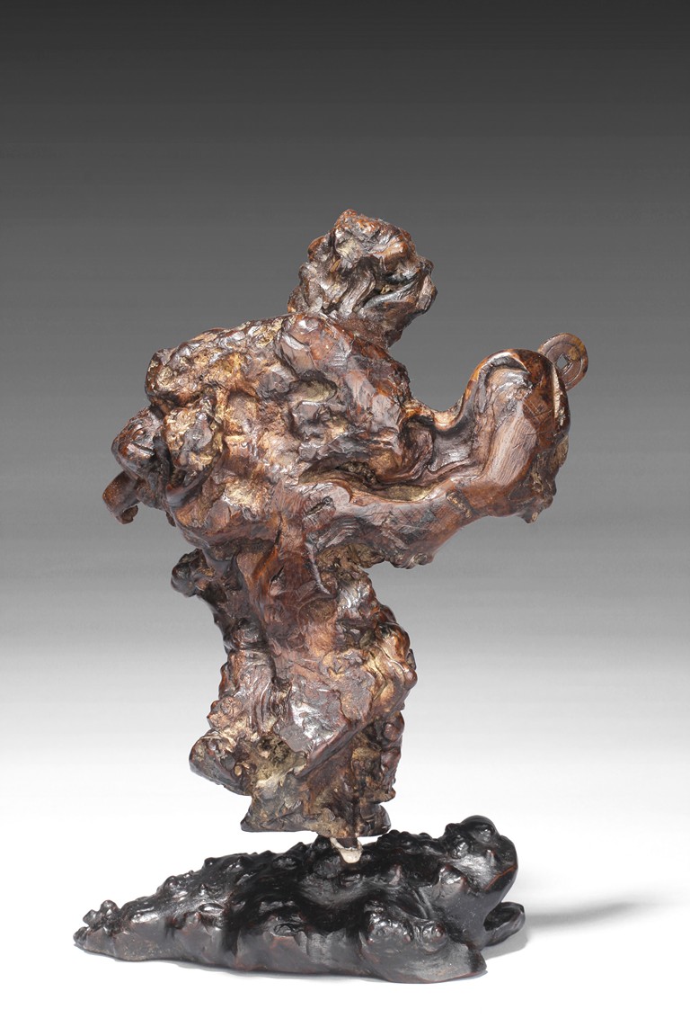 The well carved root figure depicts Liu Hai holding a Chinese coin, standing with one foot on top of the frog. Republic period.