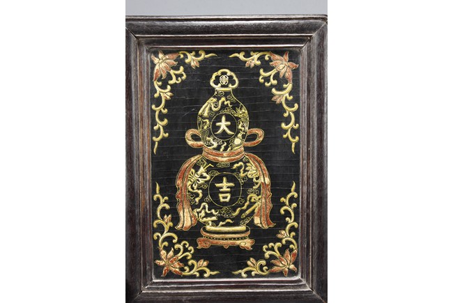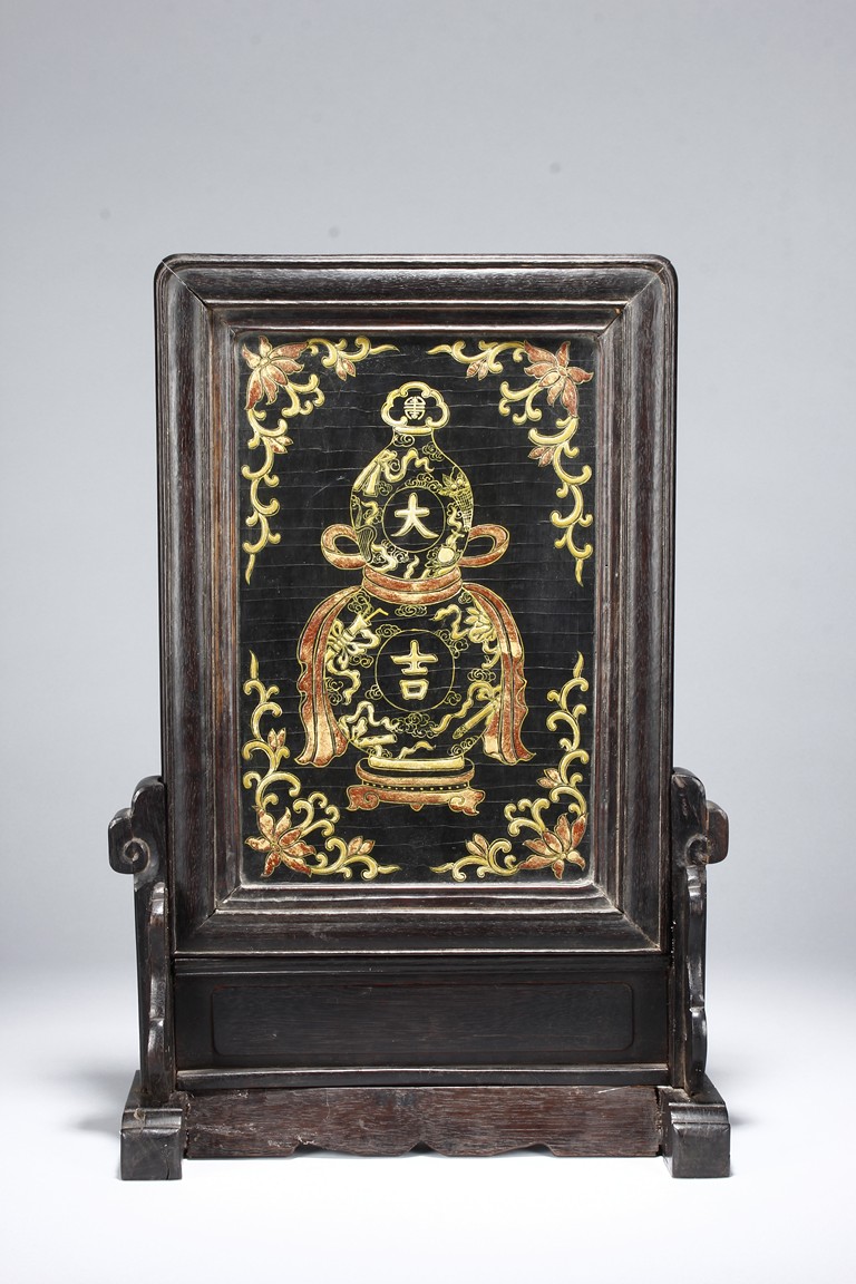 Of upright rectangular form, inlaid on a black lacquer background, the double-gourd encloses two auspicious characters 'Da' and 'Ji' within roundels and clouds and knots motifs outside the roundels. It is further flanked by scrolling foliage and flower decorations on each corner. The screen is supported by a wood frame and stand.