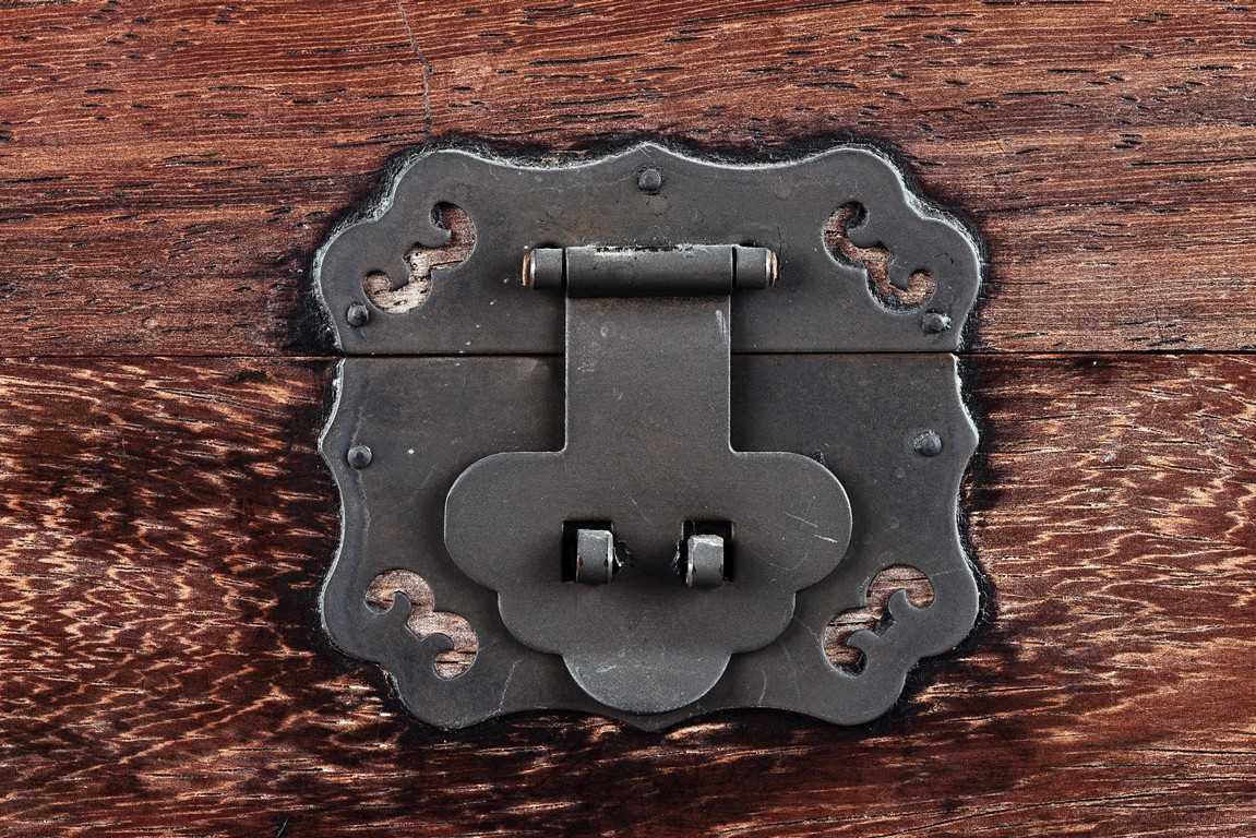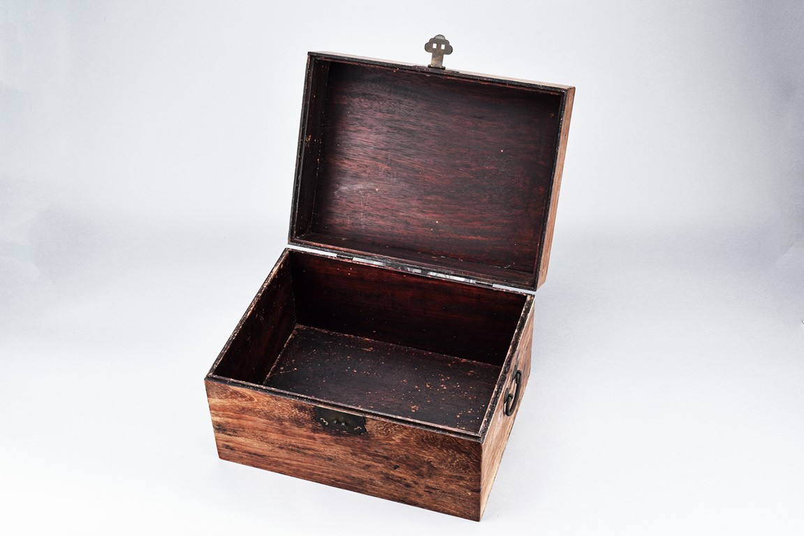 Of rectangular form, the top with ruyi shaped corner mount, the sides with bail handles, and the front with lockplate and hasp. Republic period.