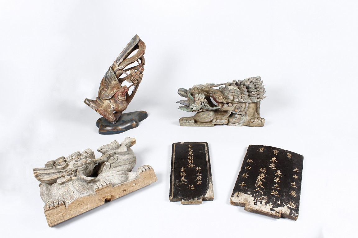 The group includes a carved wooden phoenix flying graciously, two differently designed wood carved dragons with insertion pins, and two wooden prayer tablets.