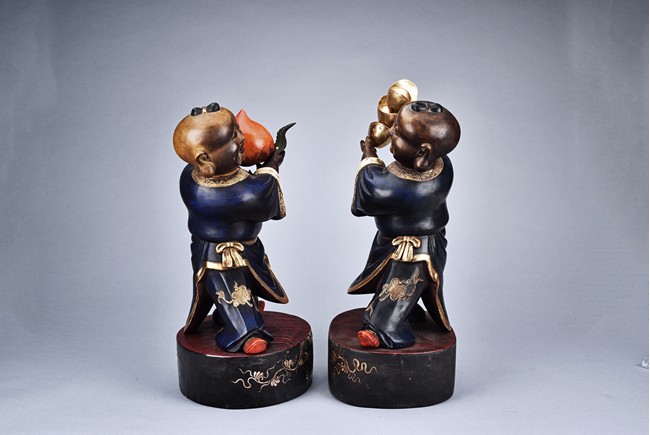 A PAIR OF PAINTED WOOD CARVED CHILDREN 彩繪木雕抱元寶桃子童子一對
