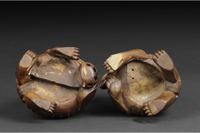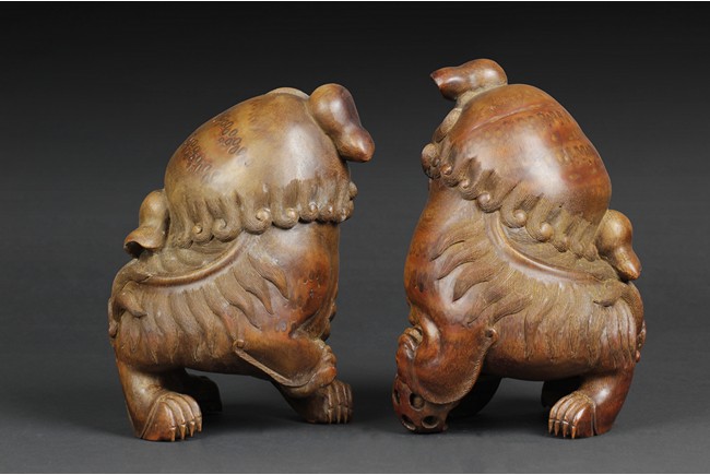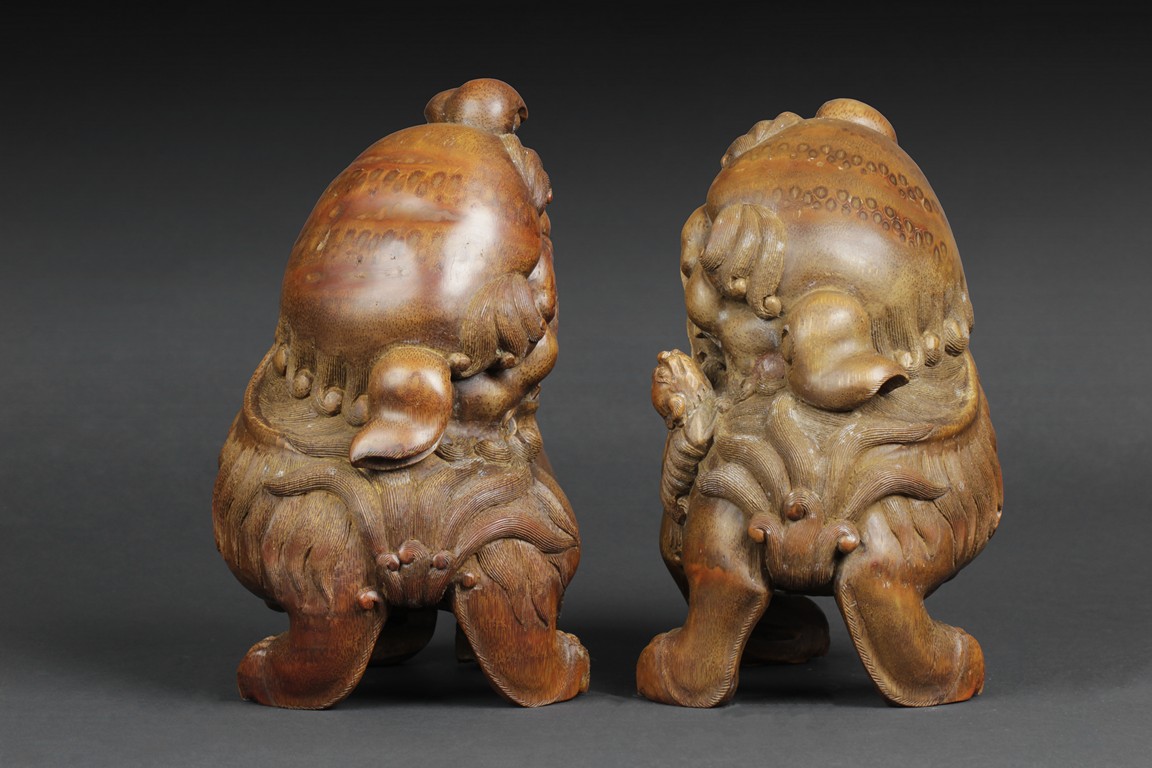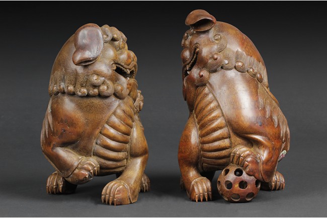Both guardian lions depicted with head turning sideways and with a playful expression; the male lion holds a ball under his left paw, while the female lion has a small cub on her side. 19th century.