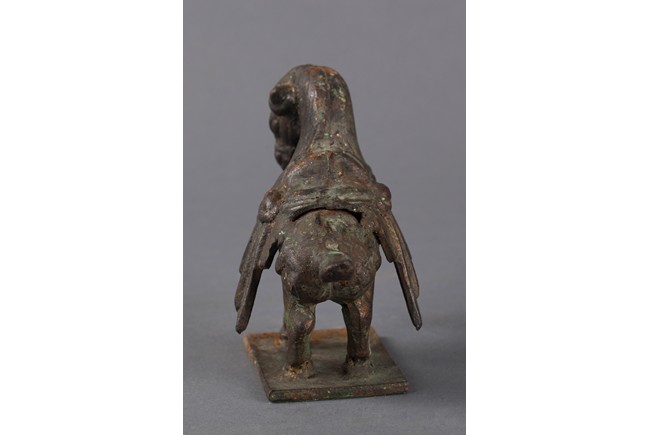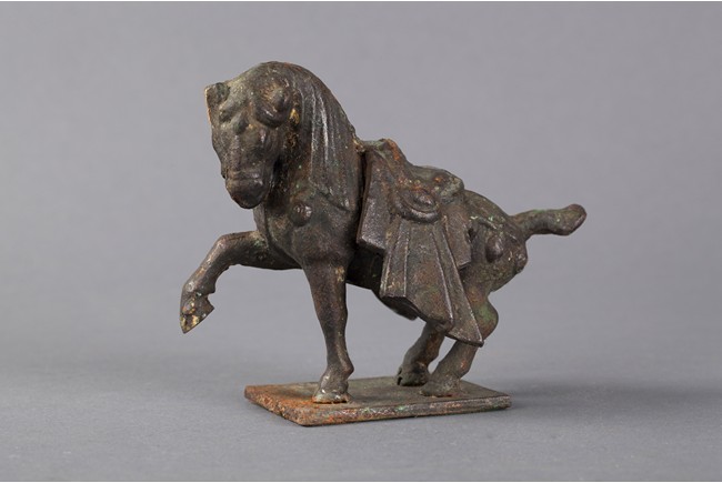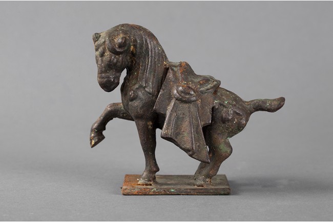 The bronze figure depicts a horse raising his front right hoof high in the air, ready to gallop forward. It has beautiful mane, and has an elaborate saddle on the back.