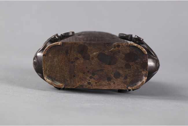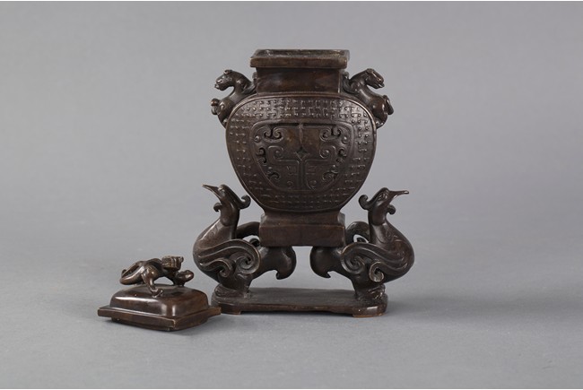 A bronze coverded vessel with two carved roosters as legs, carrying a jar-like body, with two mythical beast lying on the side as handles; one mythical beast laying on top of cover.
