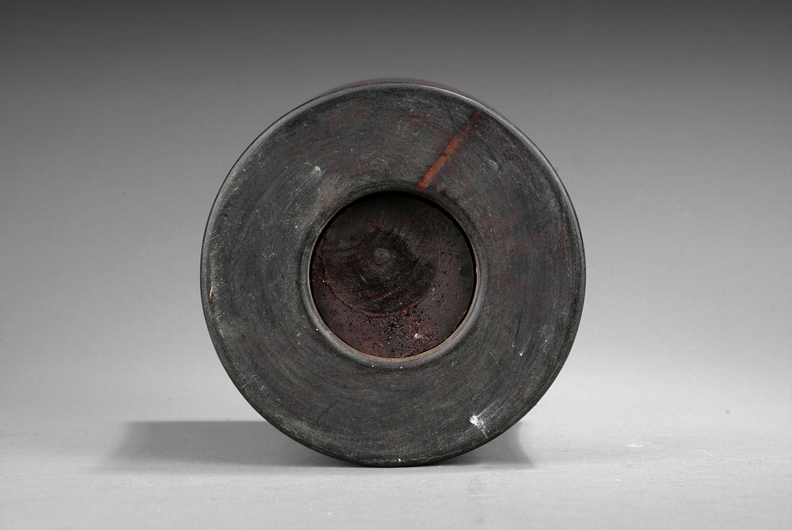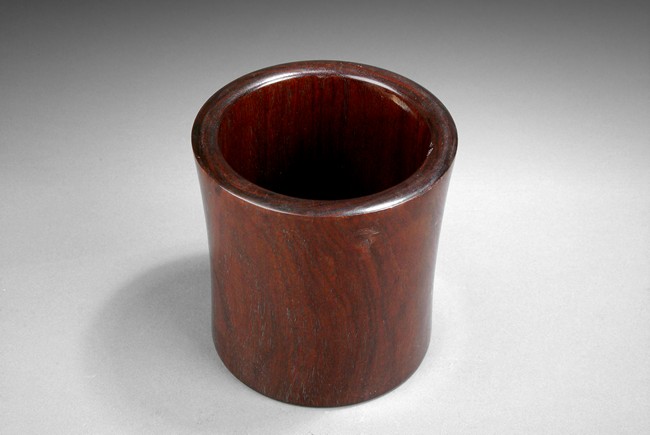 The Huanghuali brush pot is of slightly tapered cylindrical form and has an attractive grain. The base is fitted with a plug. Qing Dynasty period.
