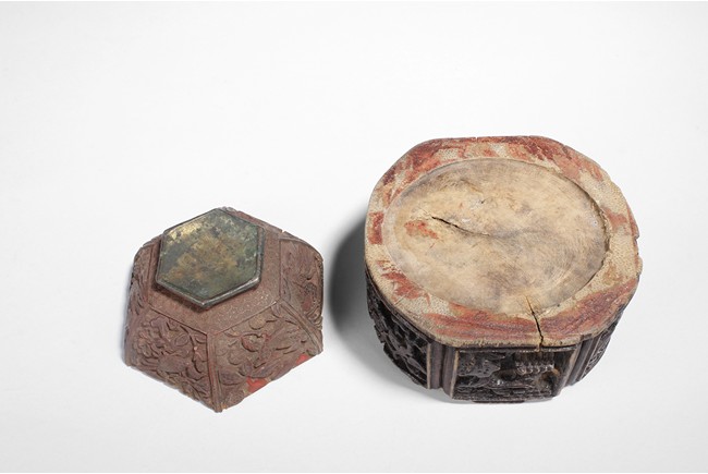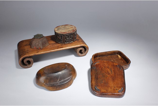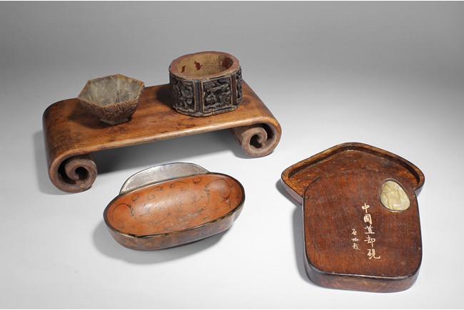 The group includes a wooden ink stone box with a inlaid stone on the top surface of the case, a round carved container, a hexagonal bowl, and an oval shaped bowl.