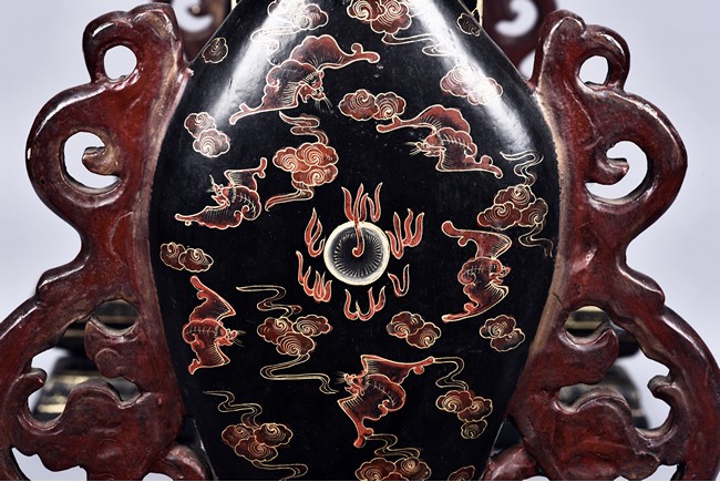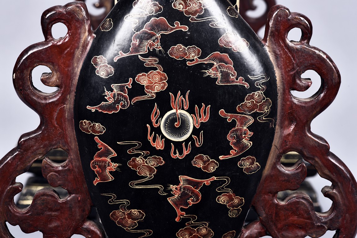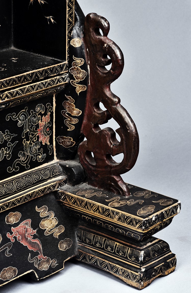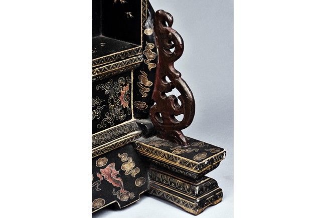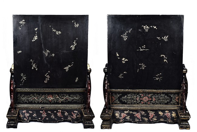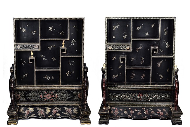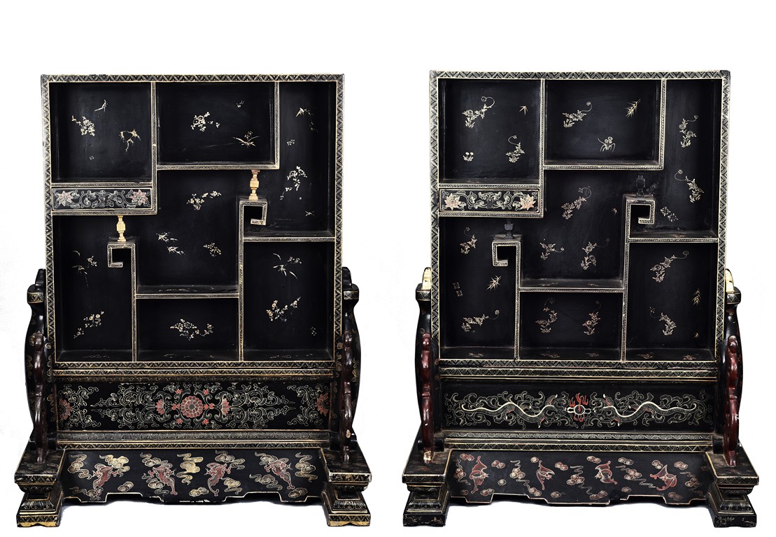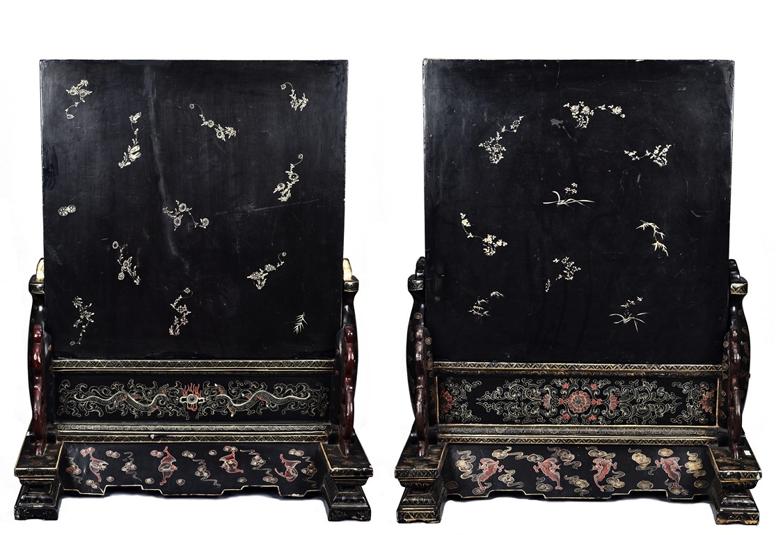 Each rectangular table screen is divided into seven rectangular compartments of different sizes, height, and arrangements and one drawer, all framed by gilt-painted border, the black-lacquered back panel gilt-painted with floral sprays of bamboo, chrysanthemum, and peony, with a small drawer on left side painted with stylized symmetrical floral scroll. The side further gilted with lotus floral scrolls, and the back decorated with similar motifs of flower sprays. The screen is set into a stand with panel of two confronting stylized dragon against flaming pearl, the shaped apron finely painted with bats amid auspicious clouds. Late Qing Dynasty period.