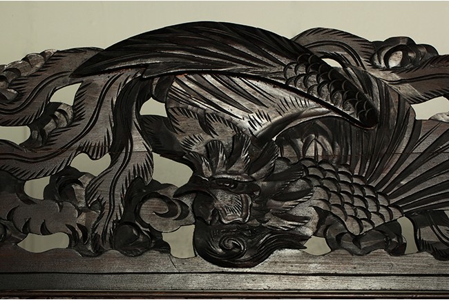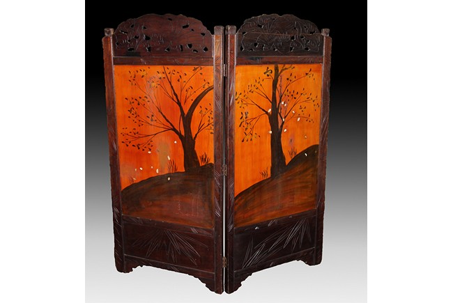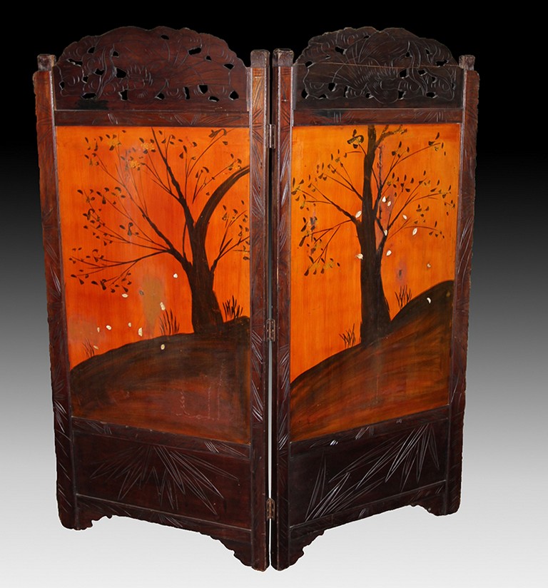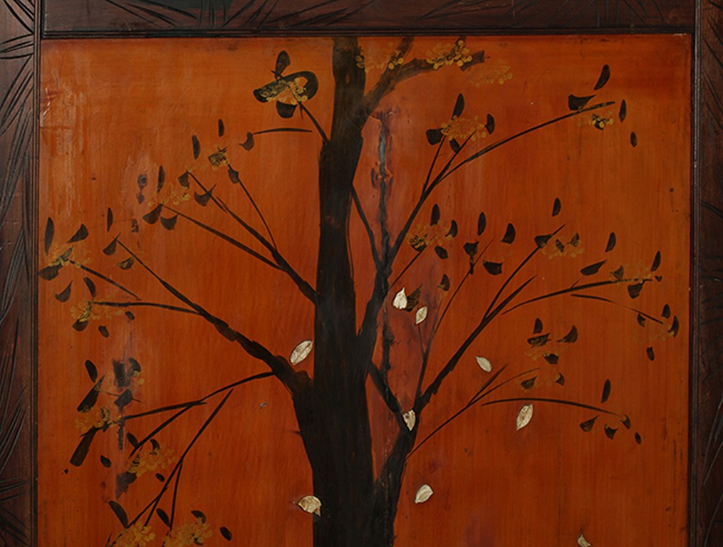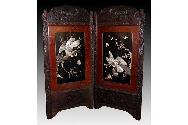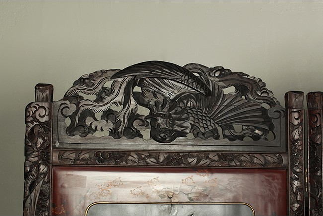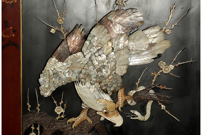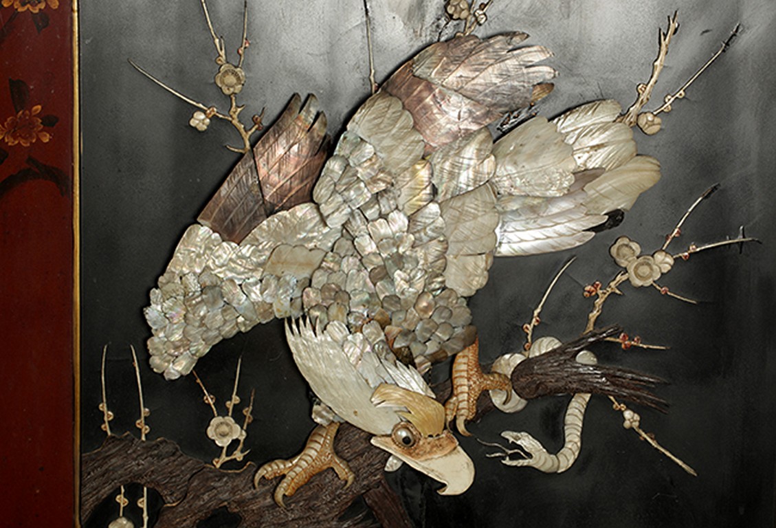 The large floor screen is composed of two separate floor screens linked in the center. The floor screen depicts two eagles, one on the branch staring down with a snake nearby, and the other on a lower branch staring up towards a bird. The scenes were created with mother of pearl, bone, wood, and other materials. The frames were low relief carved, with flowers, phoenix, and plants patterns.