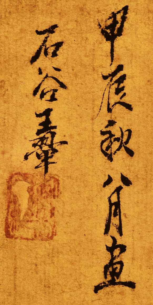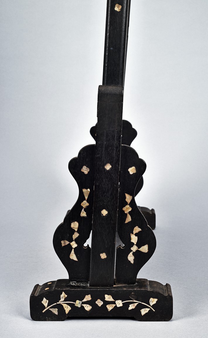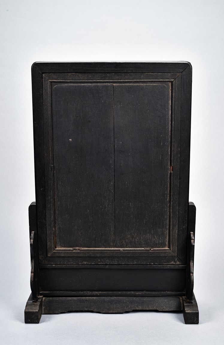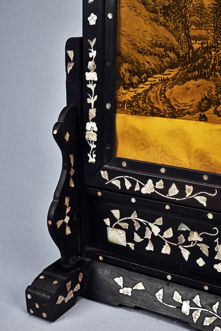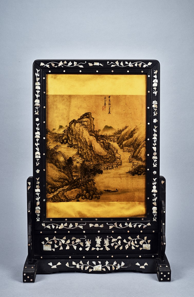 The table screen containing a color and ink on paper painting, with inscription and seal, attributed to Wang Hui, the table screen embellished with mother-of-pearl decoration. Qing Dynasty period.