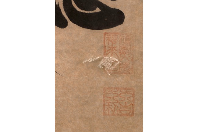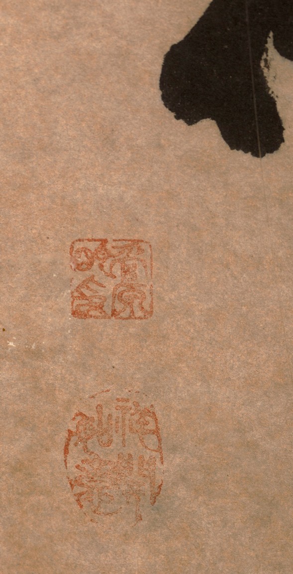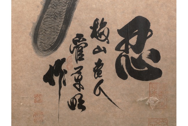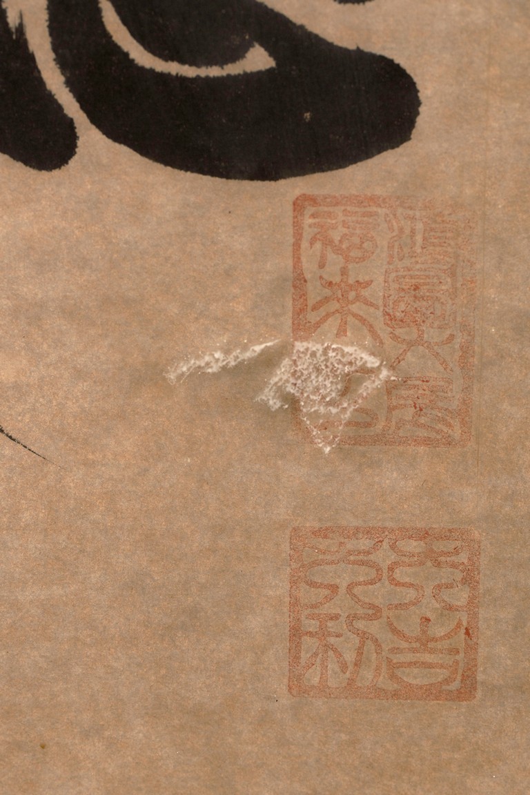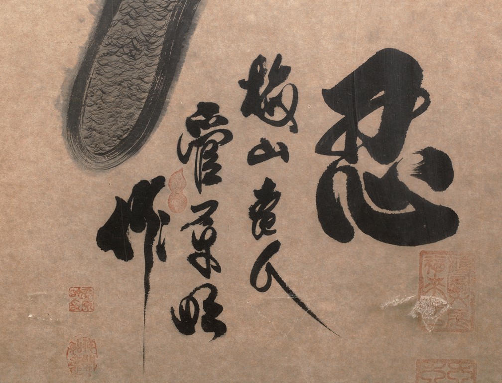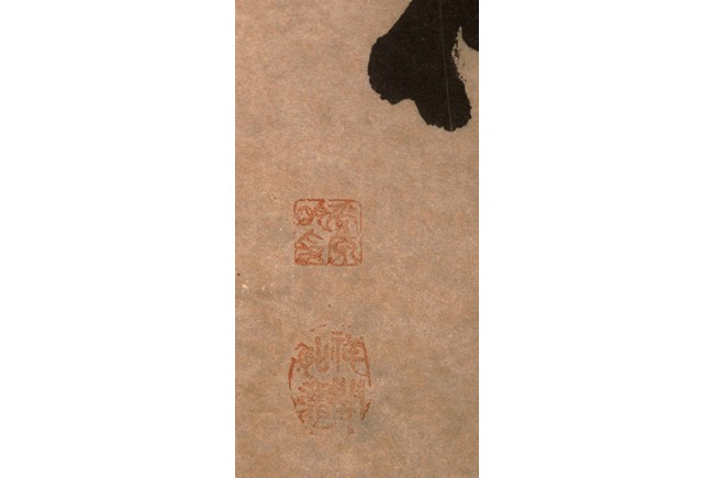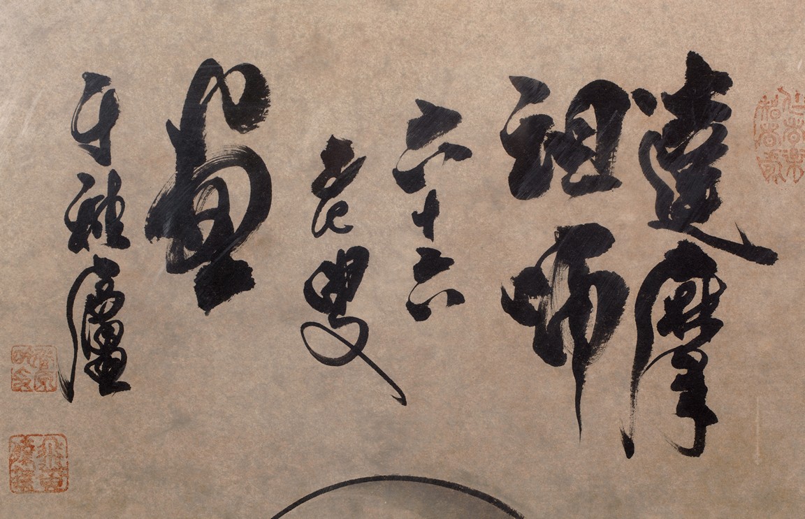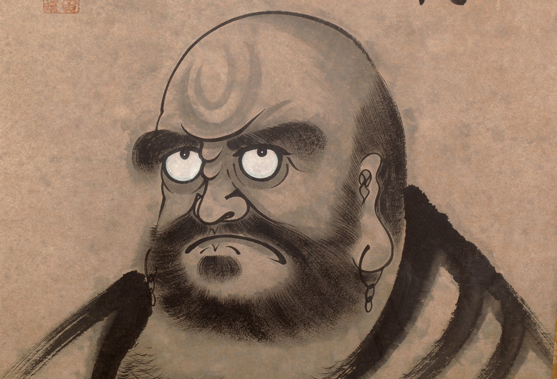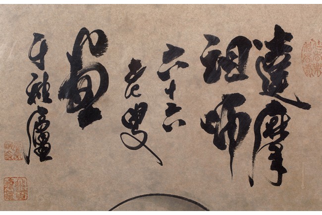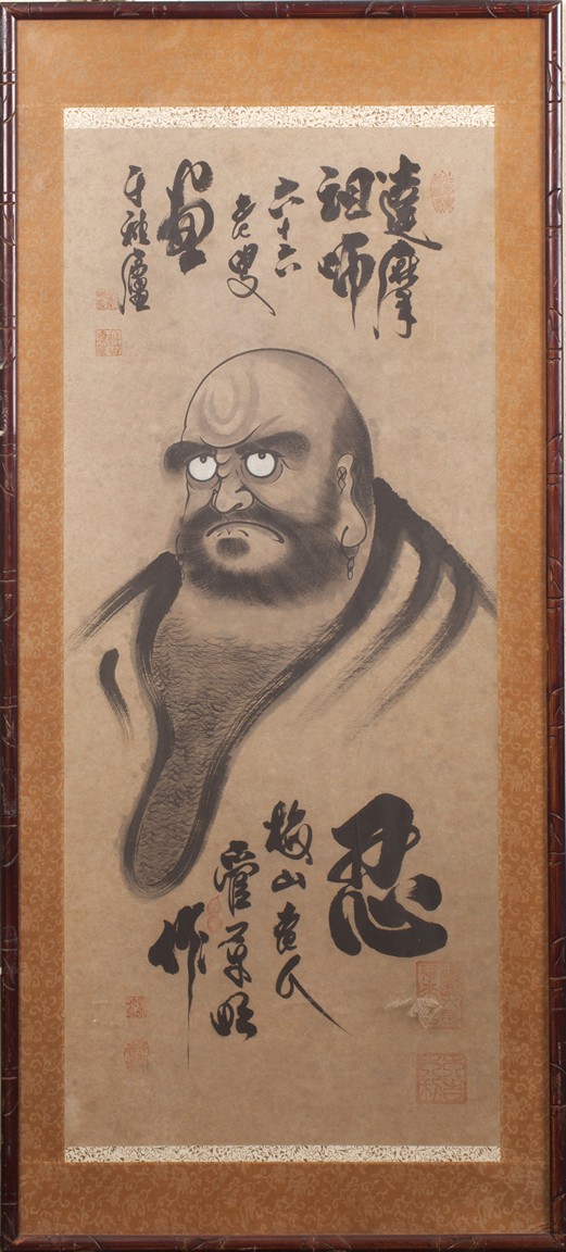 Ink on paper. Framed. This well drawn painting depicts Bodhidharma in stern expression staring upwards. With inscriptions on top and bottom. Signed and with eight seal marks of the artist.