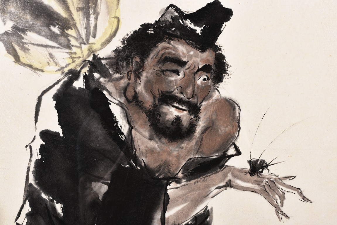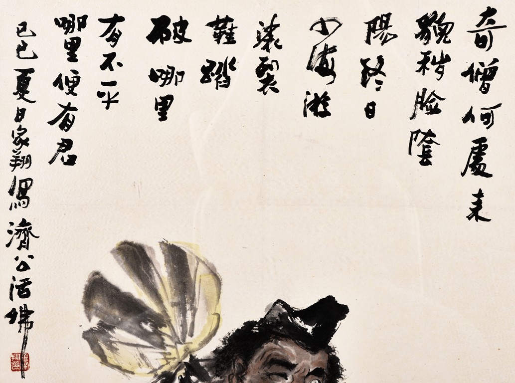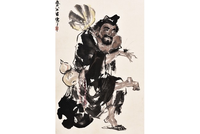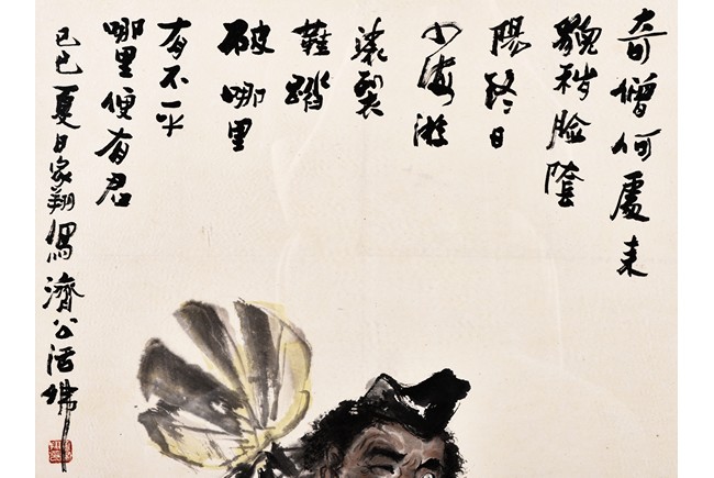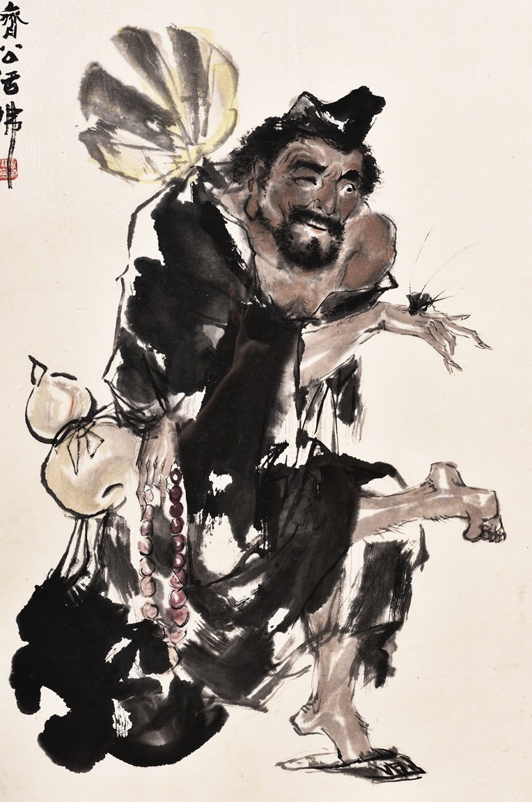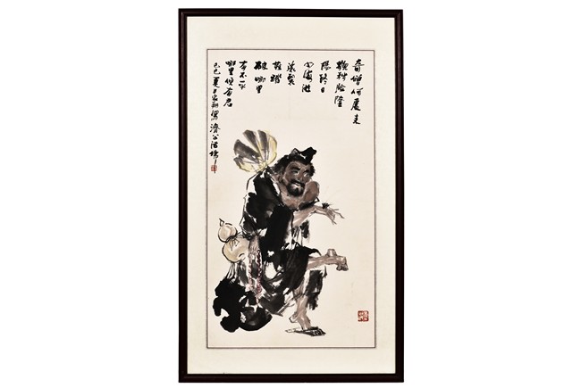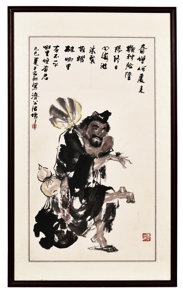 Ink and color on paper. Framed. Depicting the Ji Gong immortal. Inscribed, signed, and with two seals of the artist.