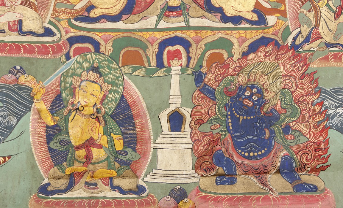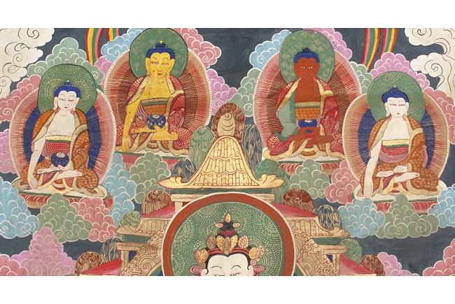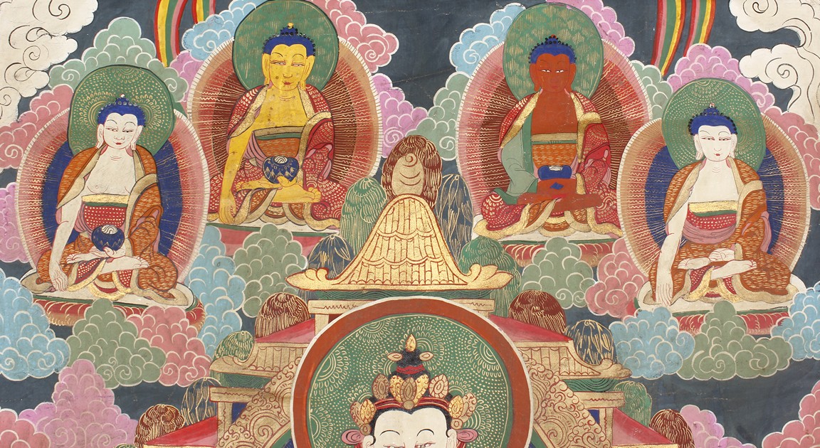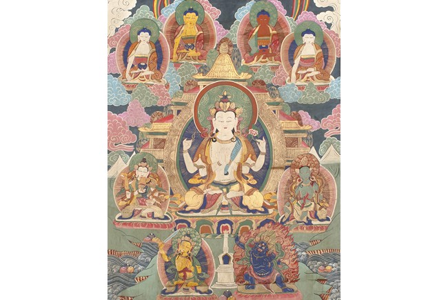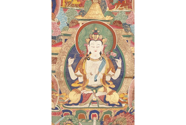 This thangka is painted on a cloth with depiction of the four-armed Shadakshari Lokeshvara as the central figure seated in dhyanasana against the background of golden palace. He is surrounded by deities and monks holding various objects seated before vibrant orange and pinkish mandorlas upon green background. Qing Dynasty Period.