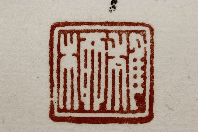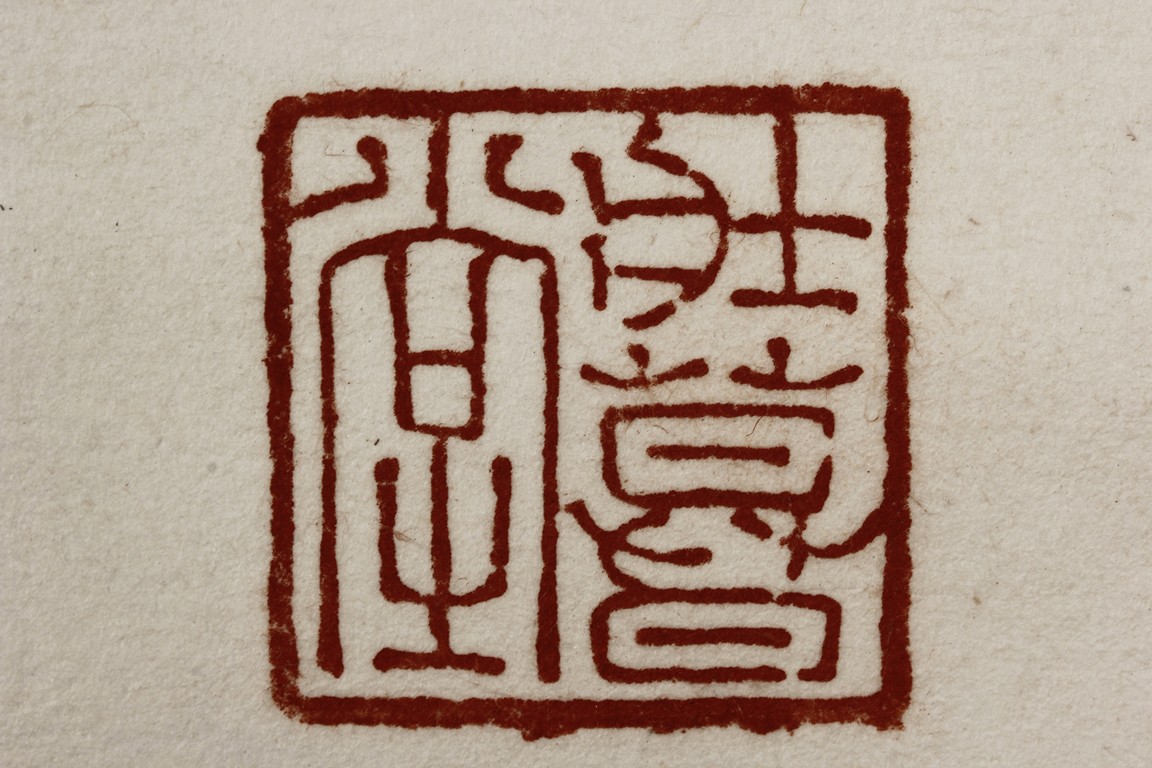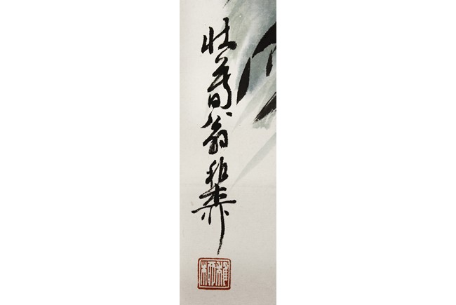 The painting depicts a bird perched on pine tree branches, surrounded by bamboo trees, leaves, and jagged stones, artist signature and mark on left side, additional marks on top right and bottom.