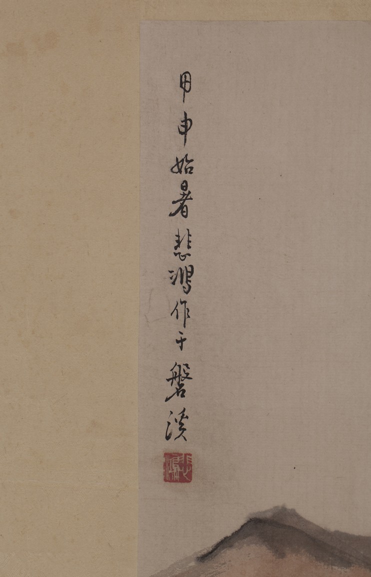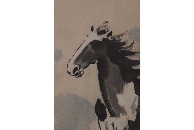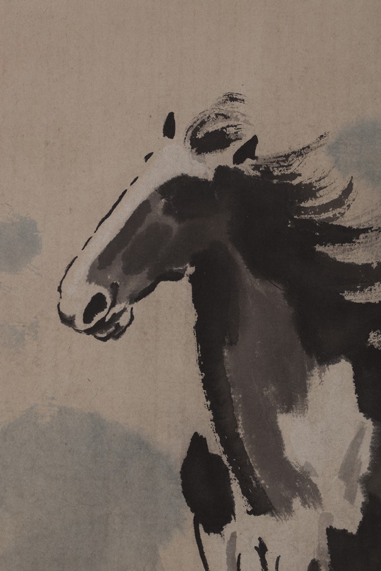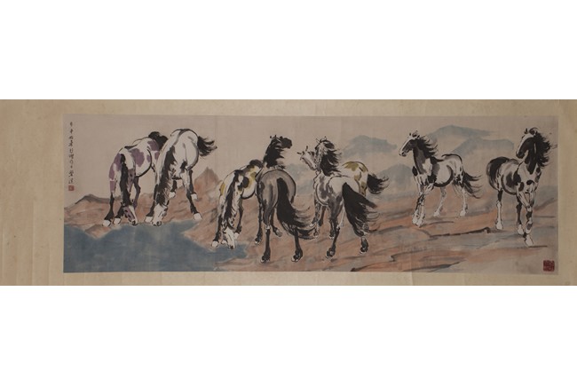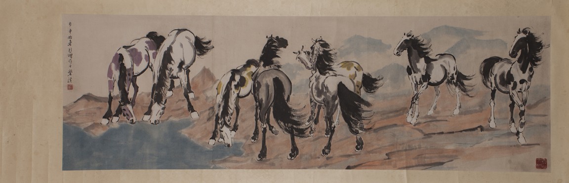 This inked painting illustrates eight strong horses relaxing in the fields. Several are strolling around while others are drinking water.