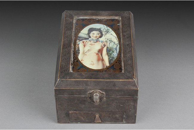 Of rectangular form, the box framed in silver, decorated with delicate flowers, bats, Chinese coins, and other patterns, the top inset with a painted beauty. The box opens to a storage area, with mirror attached on the cover, and a drawer opens from bottom for additional storage. The bottom bears the date and company mark. Republic period.