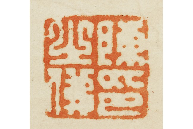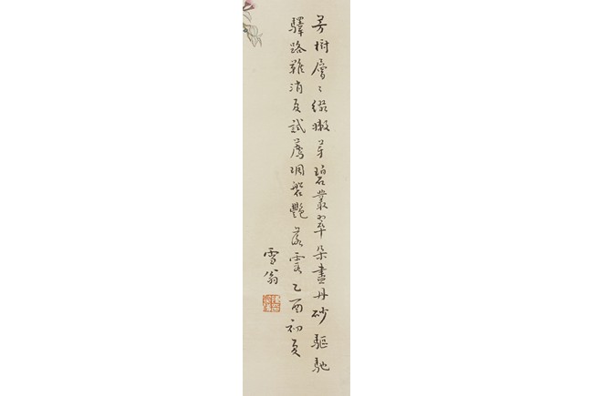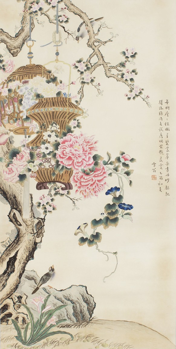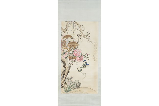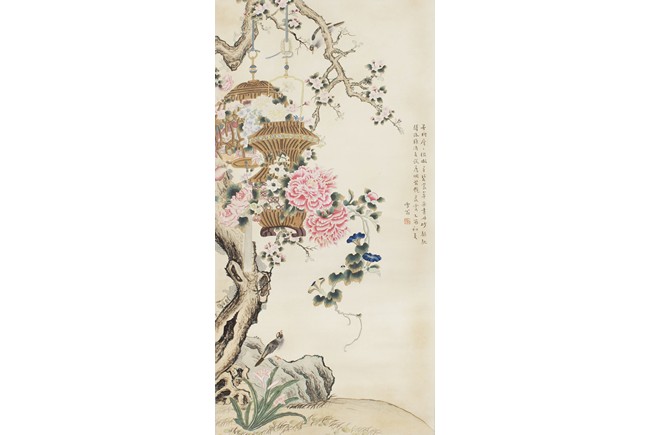 "Color and ink on paper, hanging scroll. The painting depicts a scene of blossoming flowers on a tree with flower baskets, and two birds perched on stone and branch. Chinese colophon, artist signature and mark ""Chen Zhifo"" on the right side."