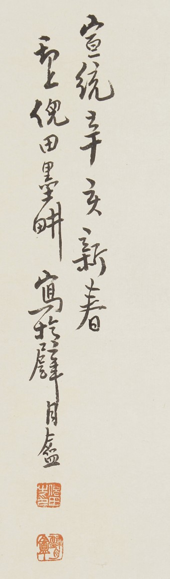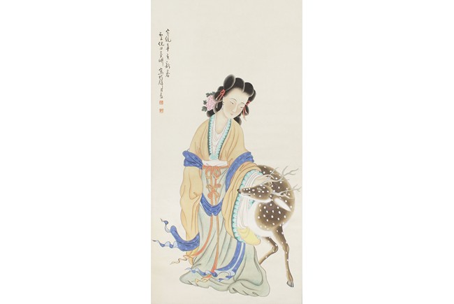 "Color and ink on paper, hanging scroll. The painting depicts a well dressed beauty sympathetically petting a sika deer with prominent stags and spot patterns. Chinese colophon, artist signature and mark ""Ni Tian"" on the top left corner."