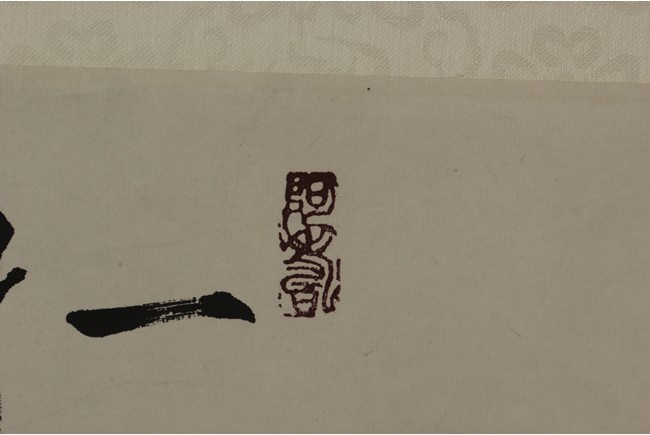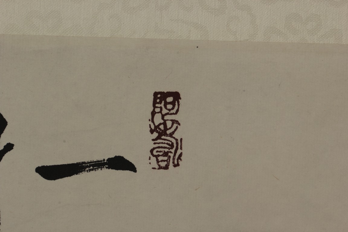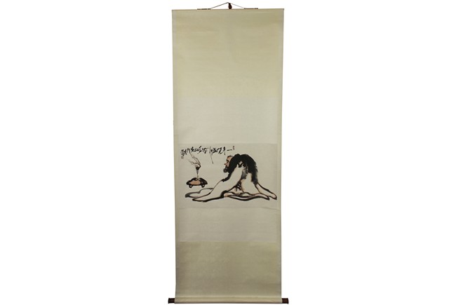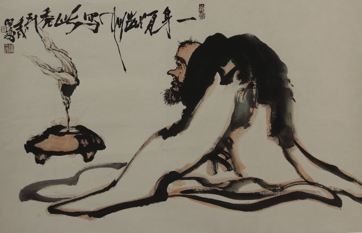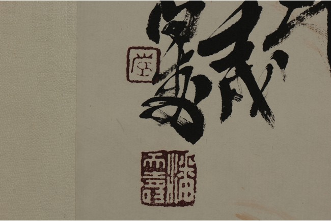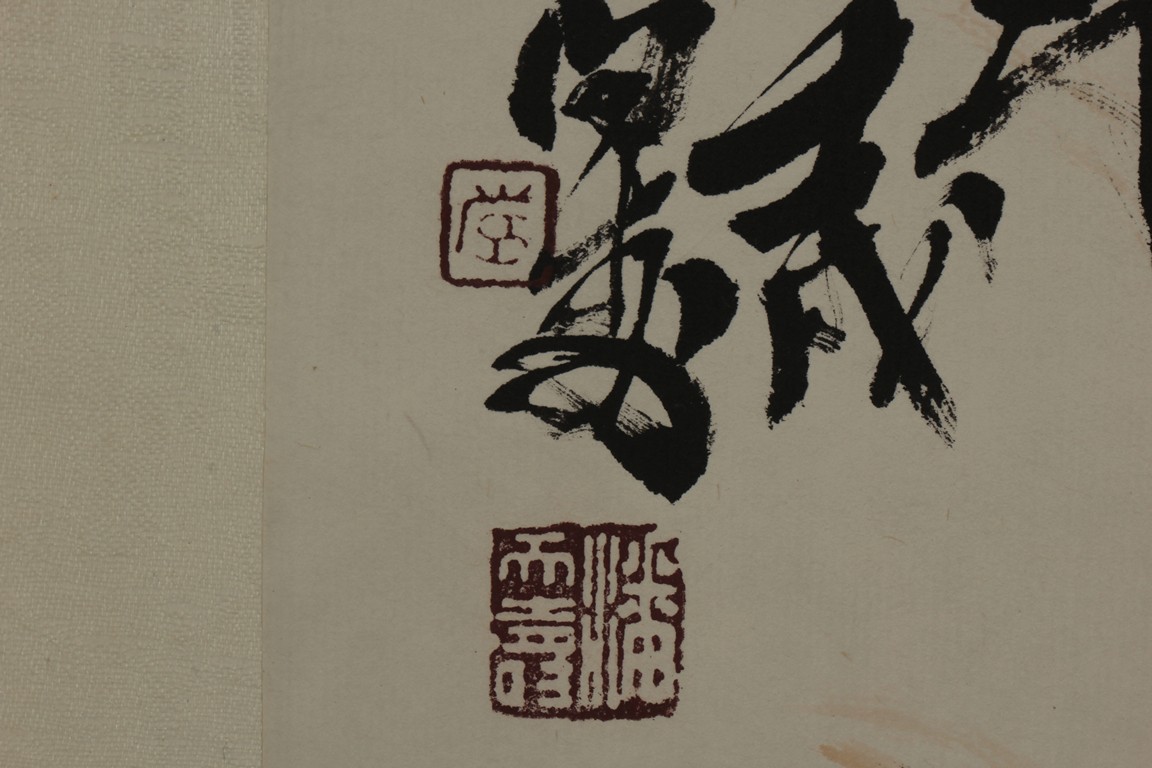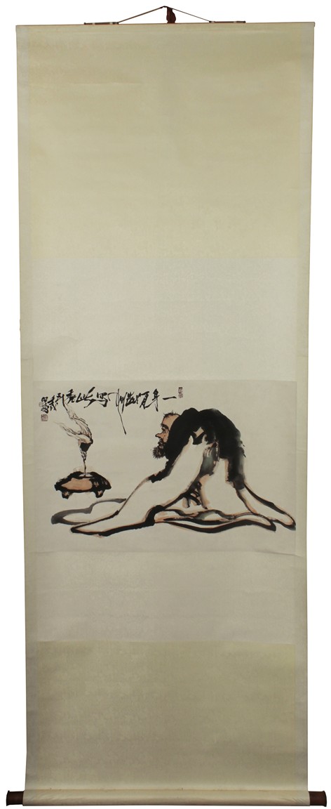 Ink and color on paper painting, hanging scroll. Painting depicts a seated Bodhidharma, facing away, with a censer in front of him. Artist signature and mark 'Pan Tianshou' on top.