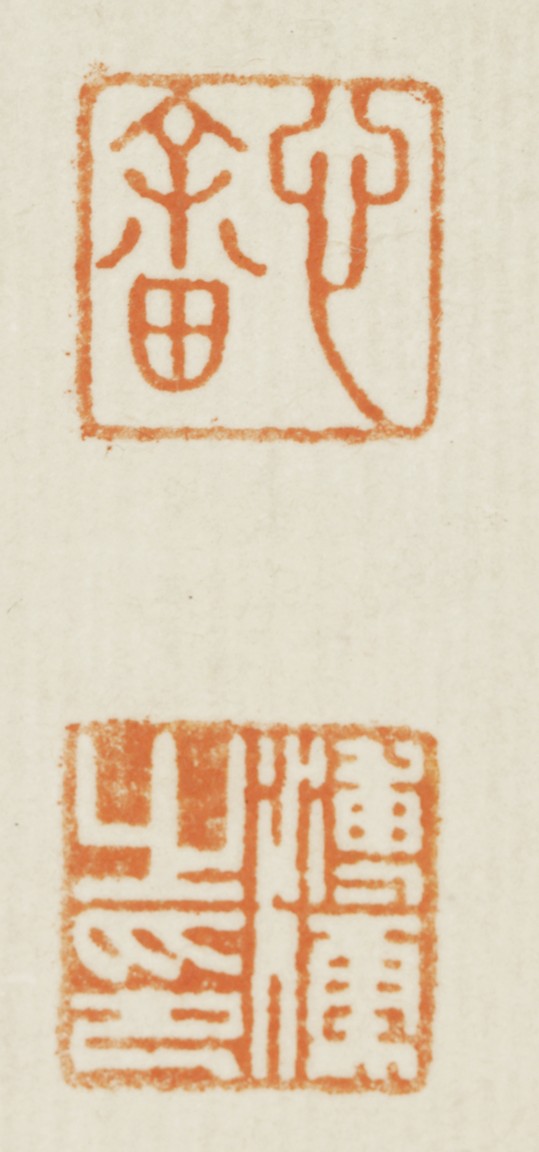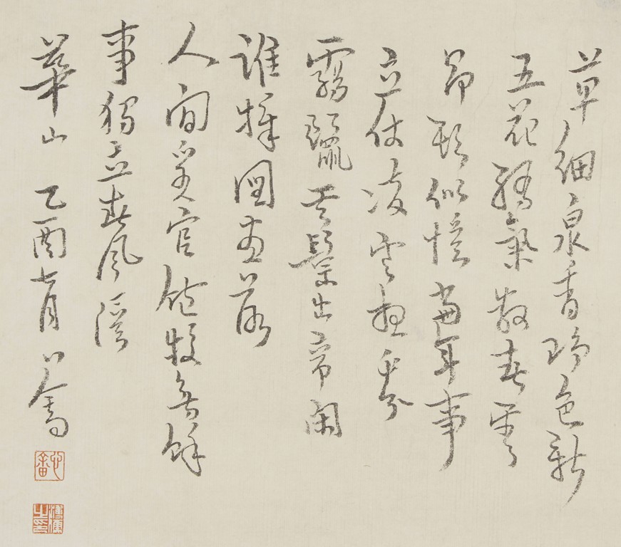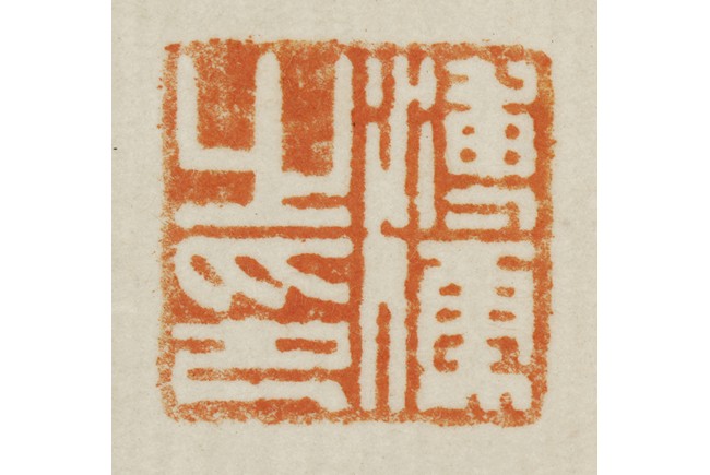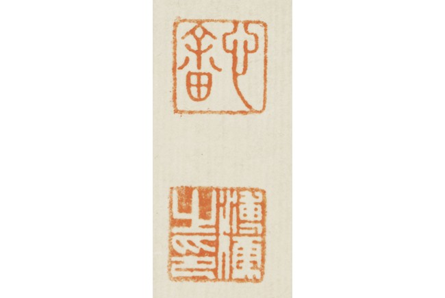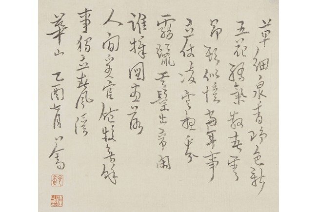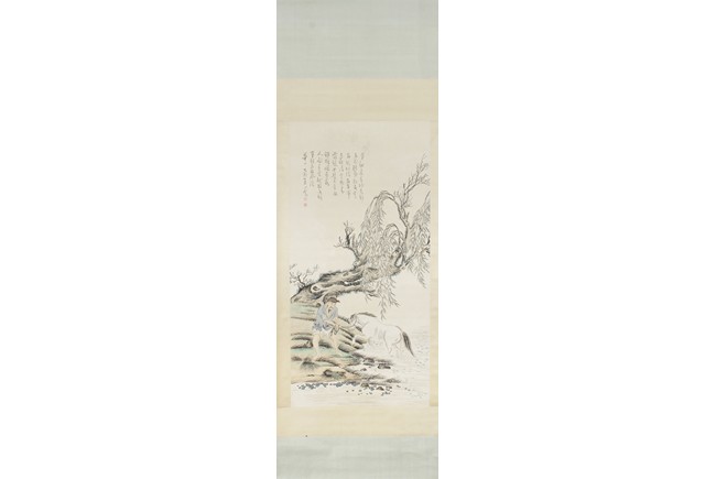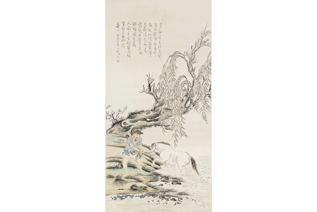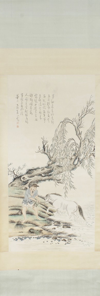 "Color and ink on paper, hanging scroll. The painting depicts a man leading a horse crossing the river, with willow tree in the background. Chinese colophon, artist signature and mark ""Pu Xinyu"" on the top left."