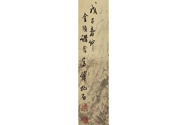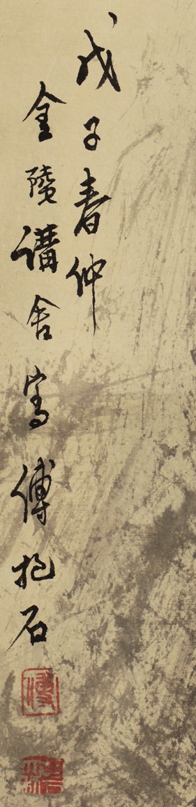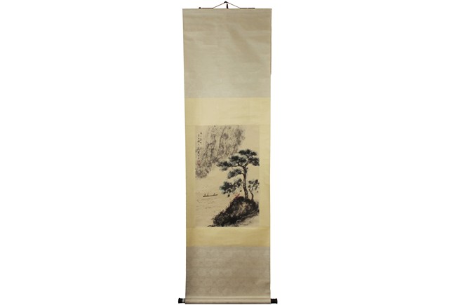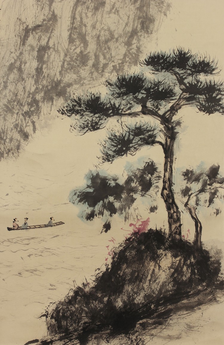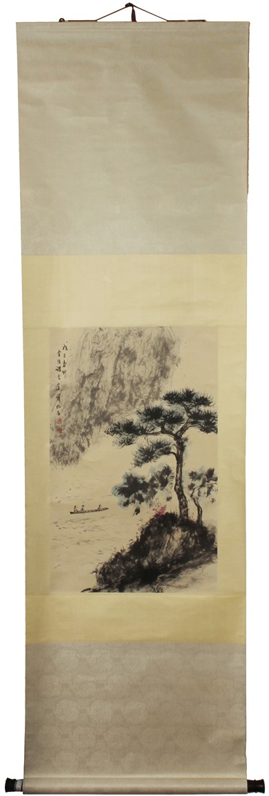 Ink and color on paper painting, hanging scroll. Painting depicts a landscape scene of mountains and pine trees, with a boat of people in the river nearby. Chinese verse, artist mark and signature 'Fu Baoshi' on top left.