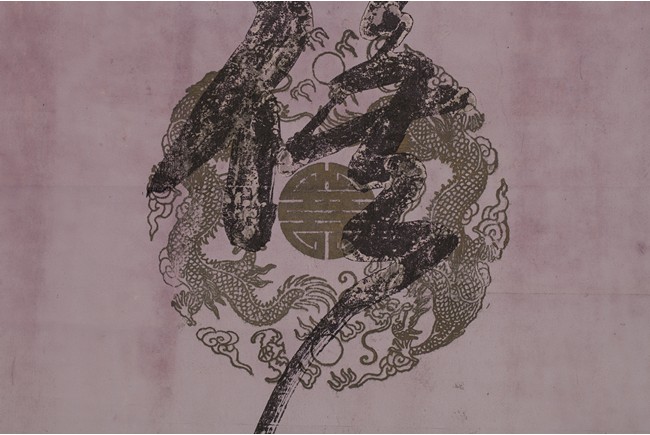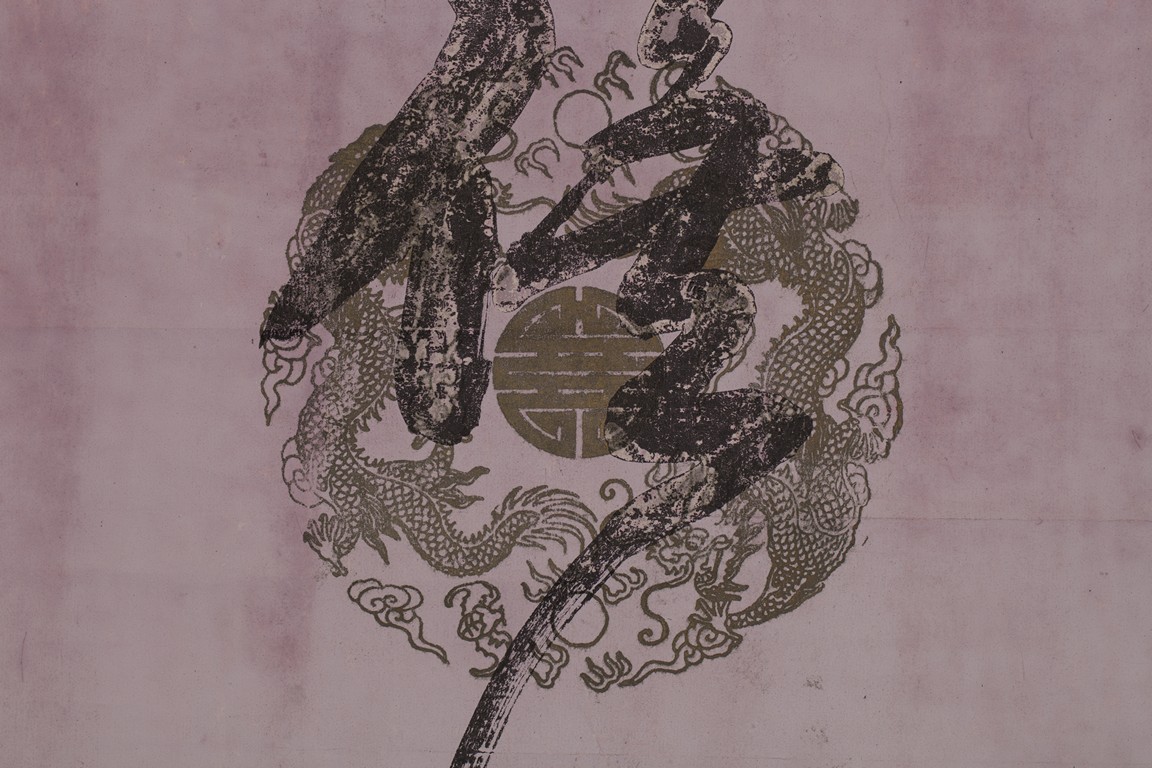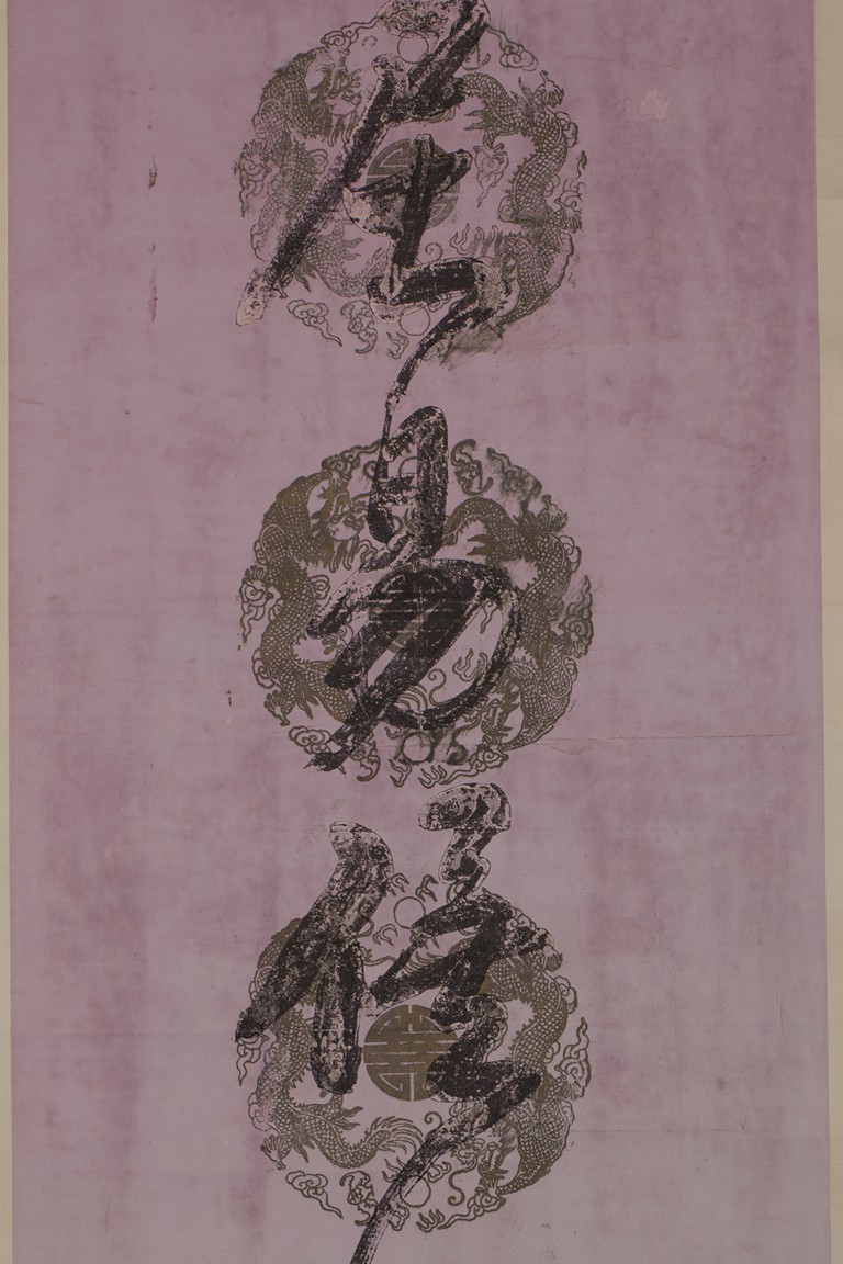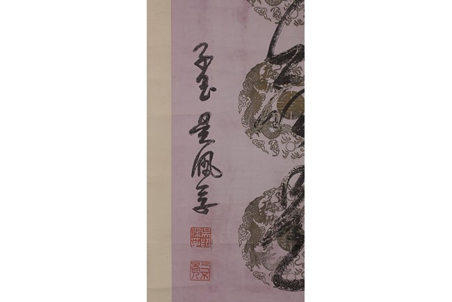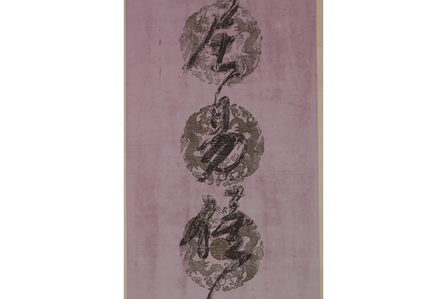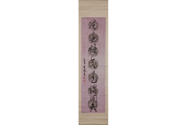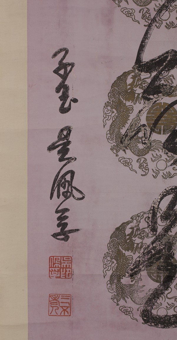 This calligraphy scroll has a violet background overall and dragon markings behind each Chinese character. Seven Chinese characters in total. Artist mark and seals can be found on the left side.