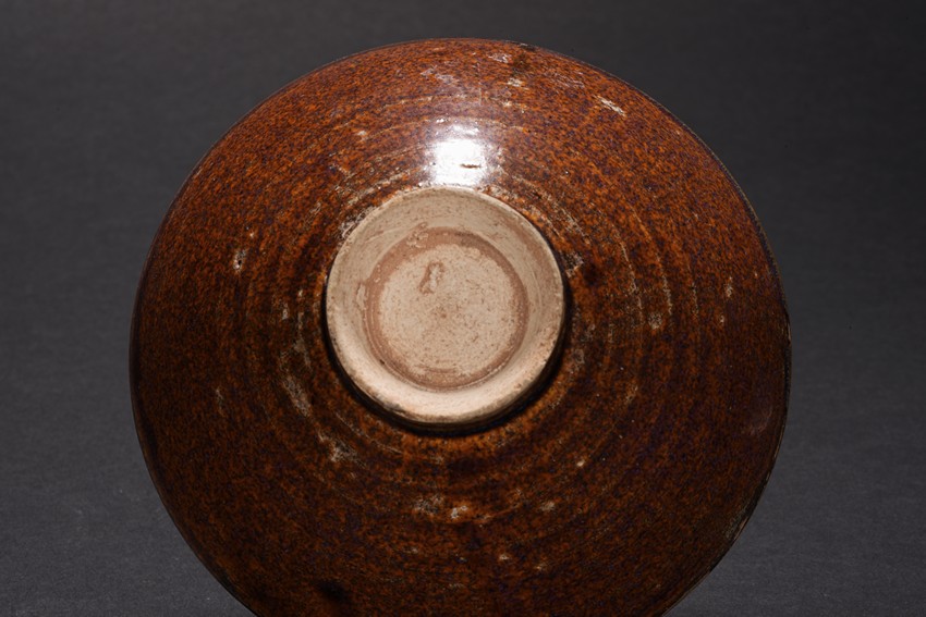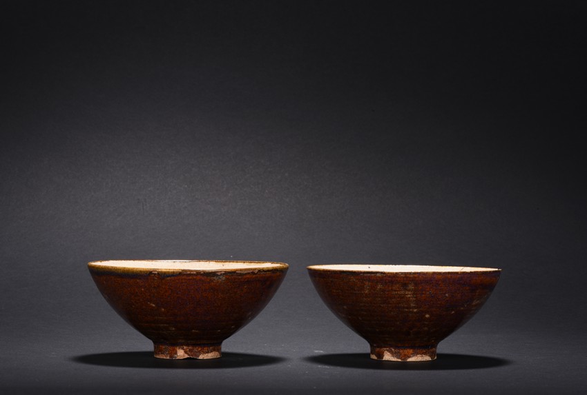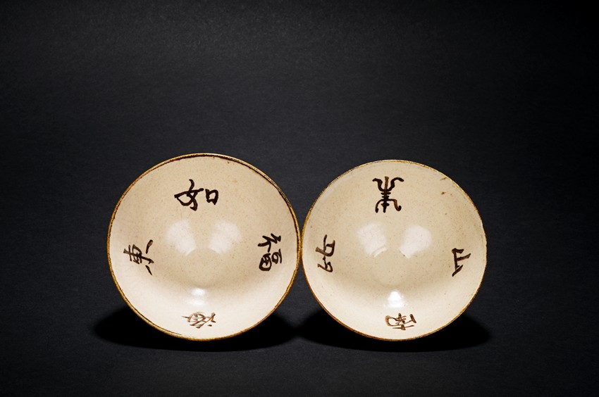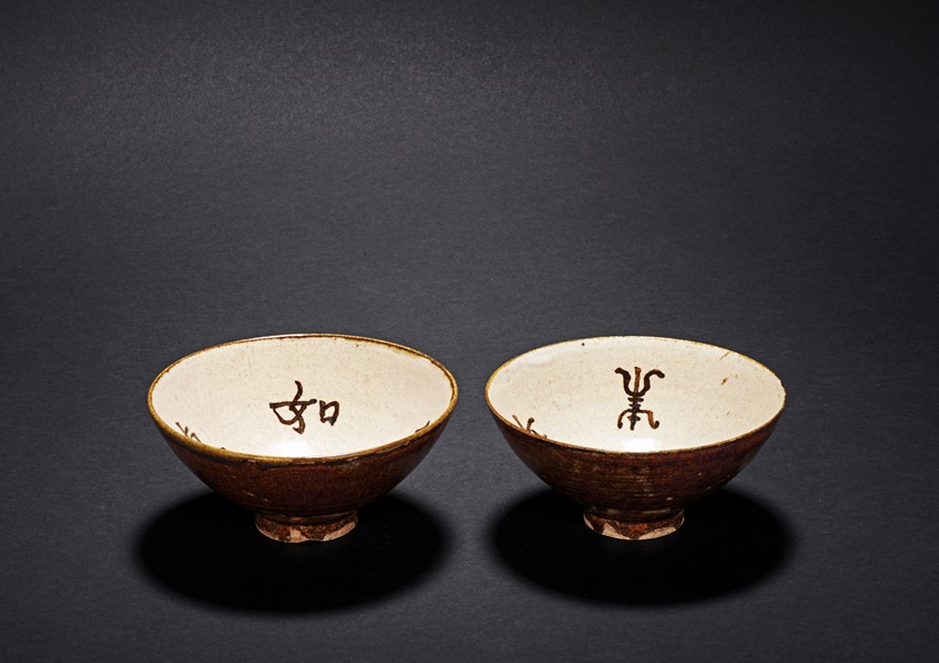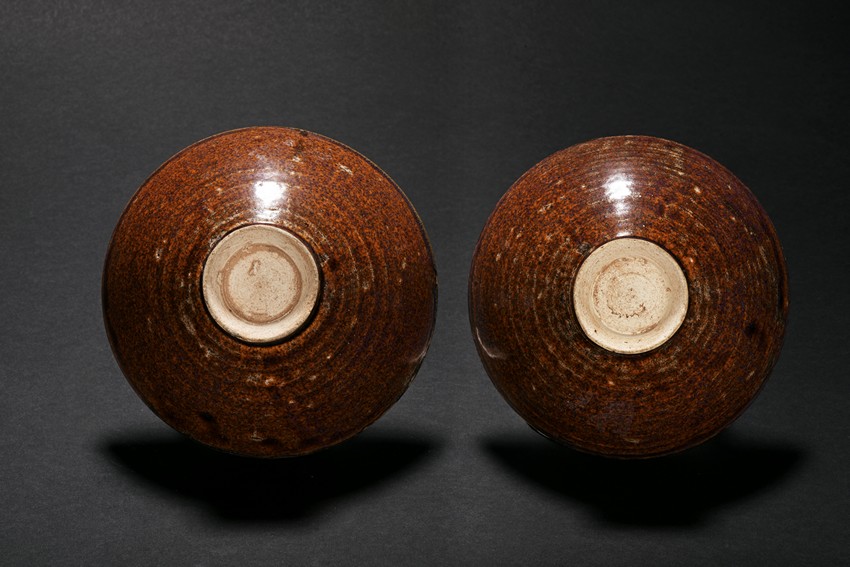 Each bowl supported on circular foot ring, exterior overall suffused with attractive brown glaze ending irregularly towards the foot exposing the unglazed base, the interior each painting with four stylized characters 'FU RU DONG HAI' and 'SHOU BI NAN SHAN' with auspicious meanings. Ming Dynasty period.