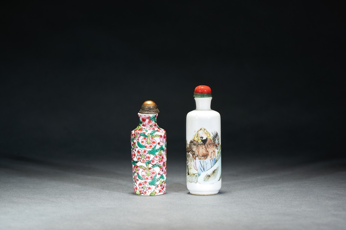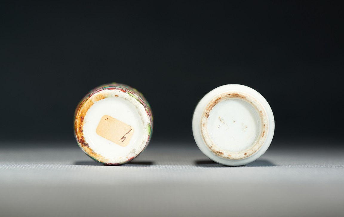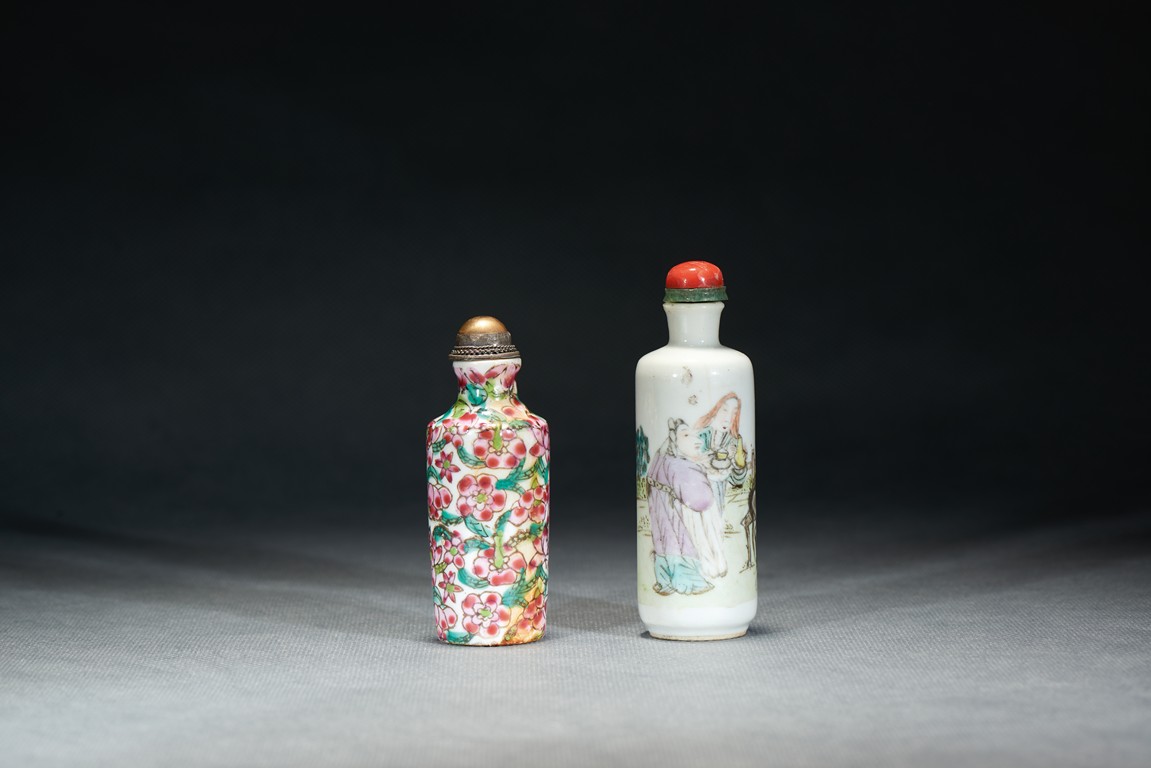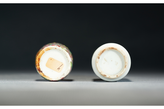Of tall cylindrical form, one decorated in famille rose with leafy peaches all over body, the other with a continuous scene of figures. Qing Dynasty period.