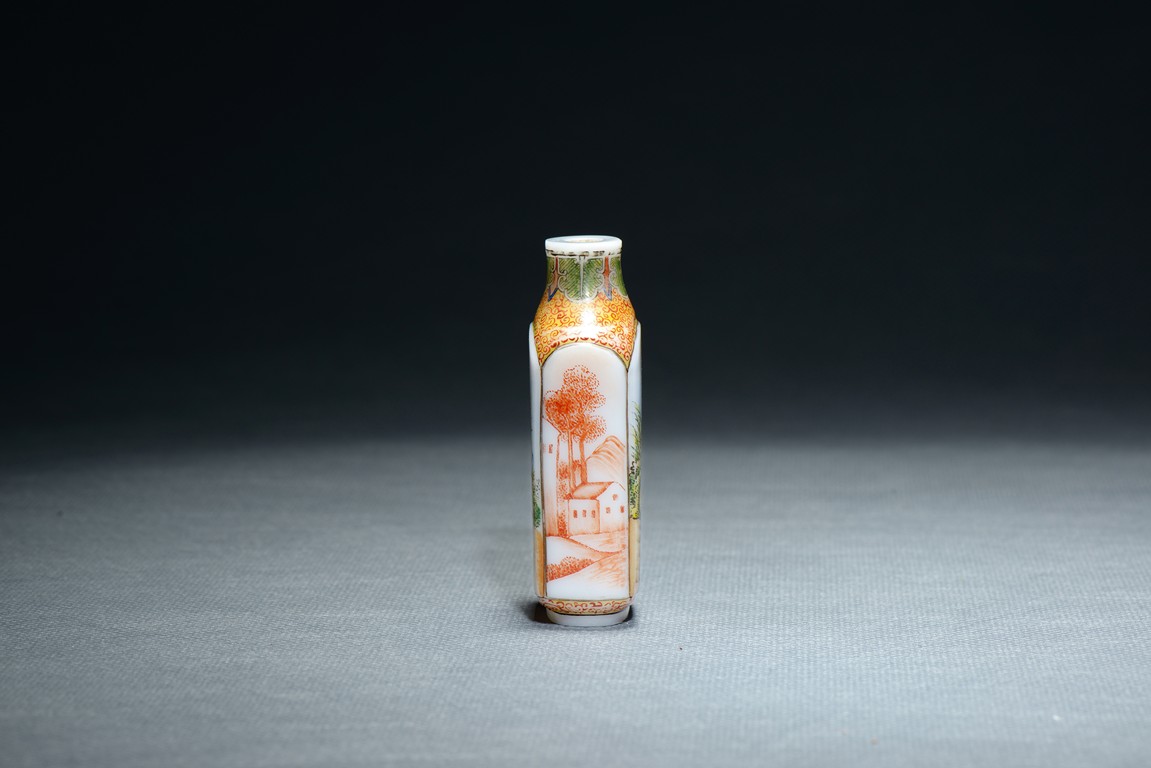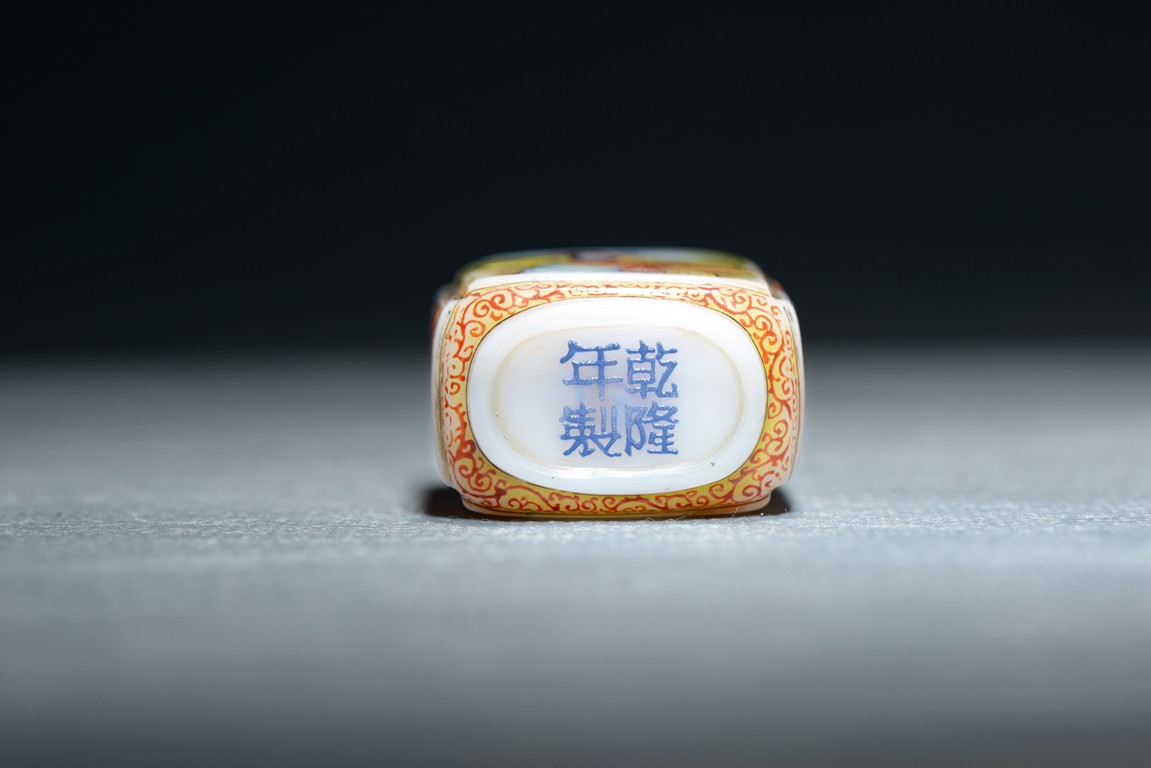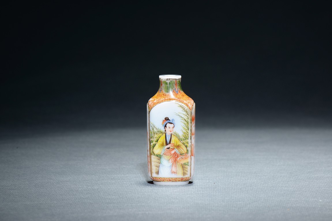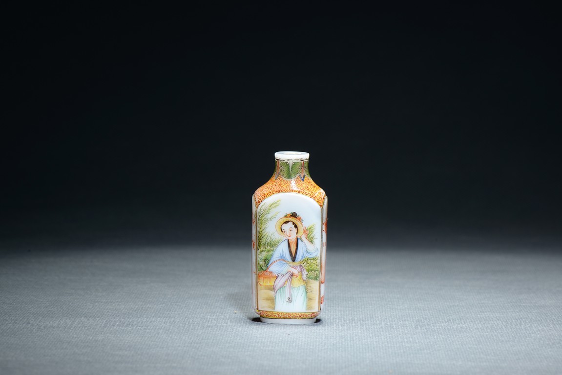 Of flattened rectangular section and elongate form, the front and back side finely decoratd with an European lady dressed in chinese-style dress and carrying a basket of fish over arm, the side enamelled with buildings and trees, the neck painted with dense scrolled motifs reserved against yellow ground, with a band of petal-lappets around the mouth rim. The base with blue enamelled four character QIANLONG mark. Possibly from Imperial palace workshop. Qing Dynasty Qianlong period.