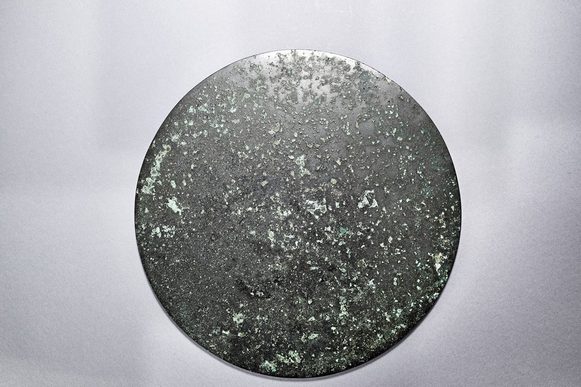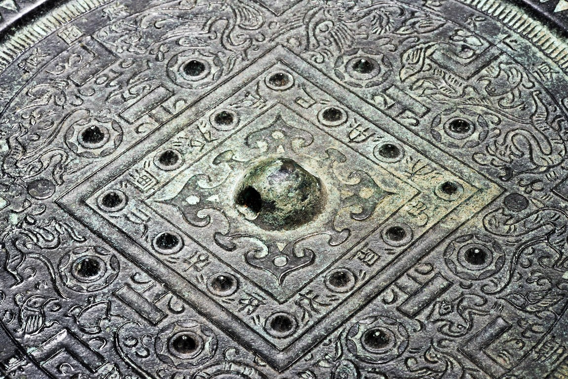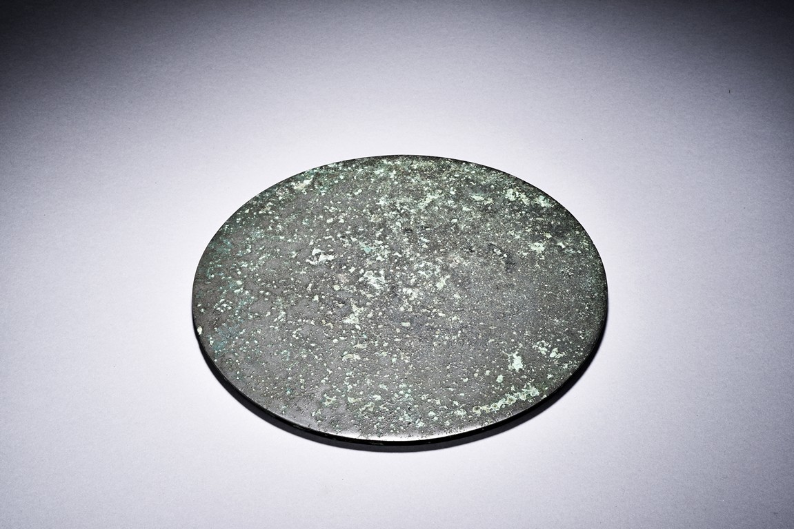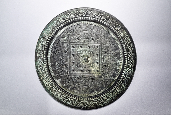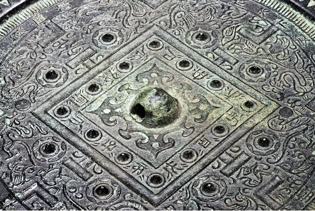 The circular bronze mirror with inscription around the central knob, with geometric pattern and scrolled cloud design.