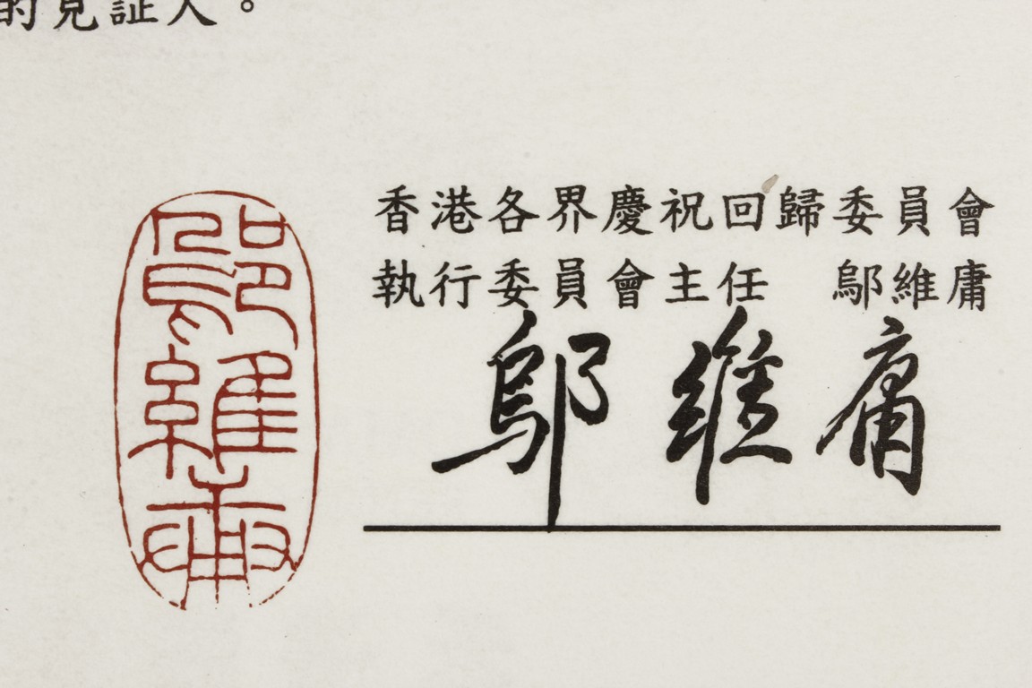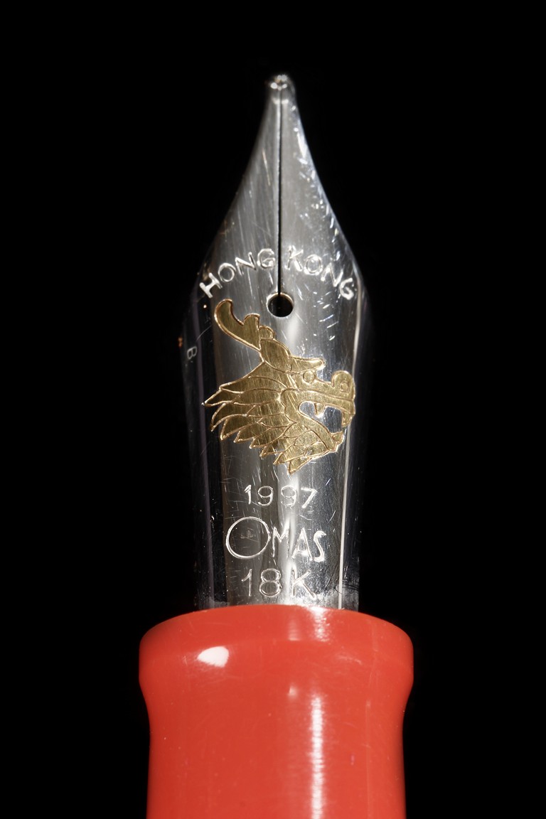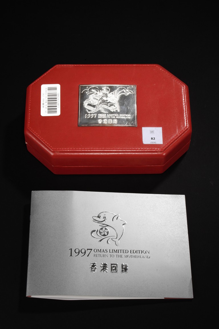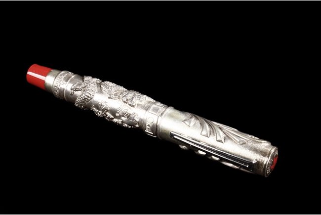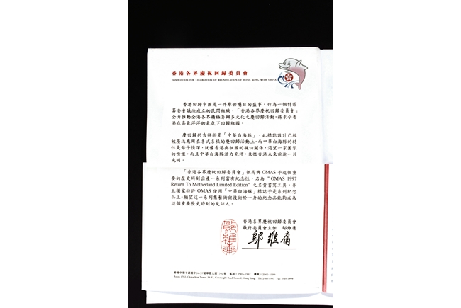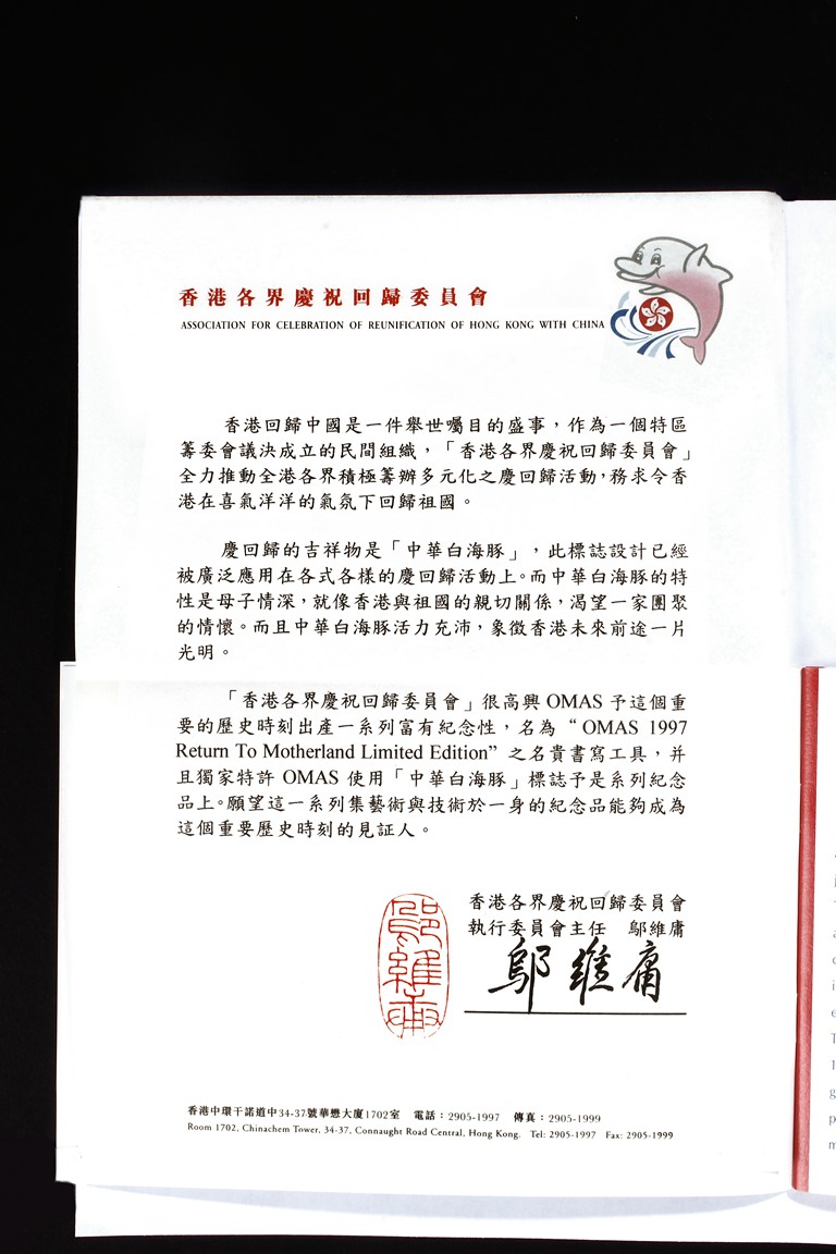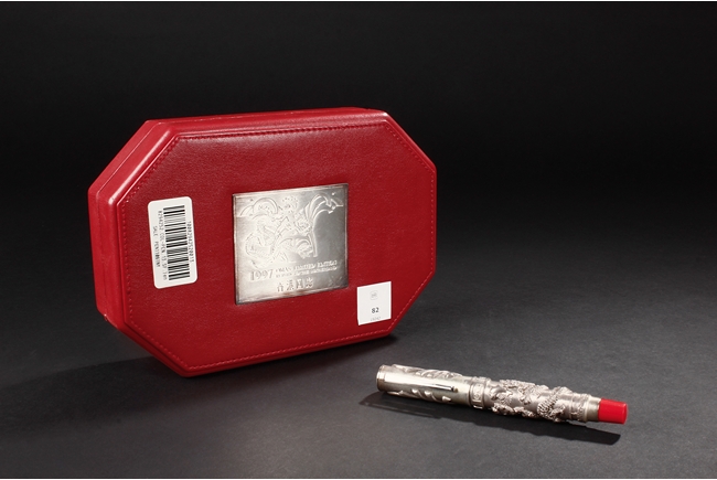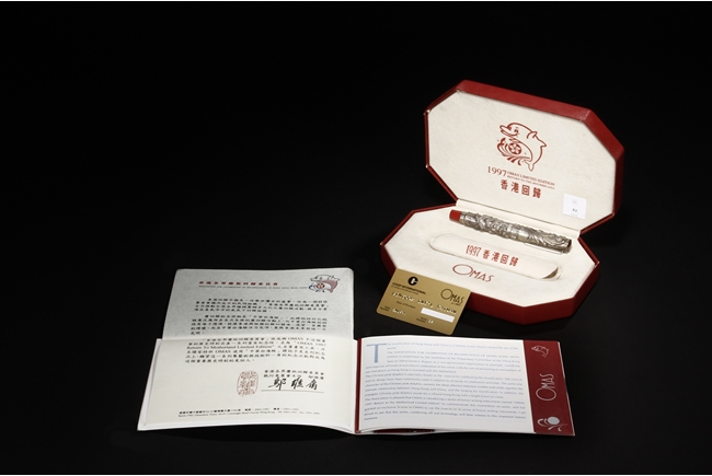 This limited edition Sterling silver and red resin fountain pen is finely cast with raised dragon motif on the barrel, water spray motif on the cap, and a dragon head on the 18K gold nib. The top of cap includes the Hong Kong orchid tree symbol and the inscription 'return to the motherland'. Also Including a certificate card with serial number 88, a signed letter, and a booklet.